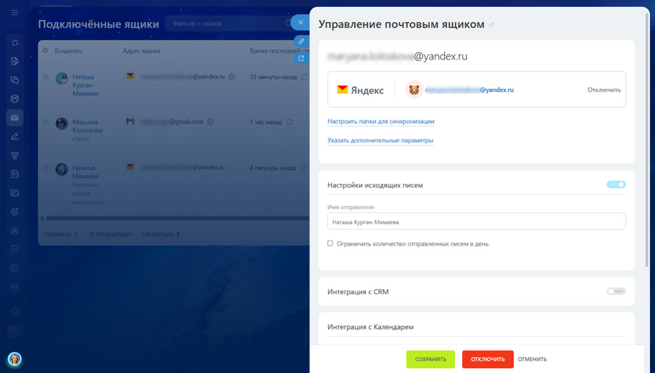 - Cвязь с CRM — включена ли интеграции ящика с CRM.