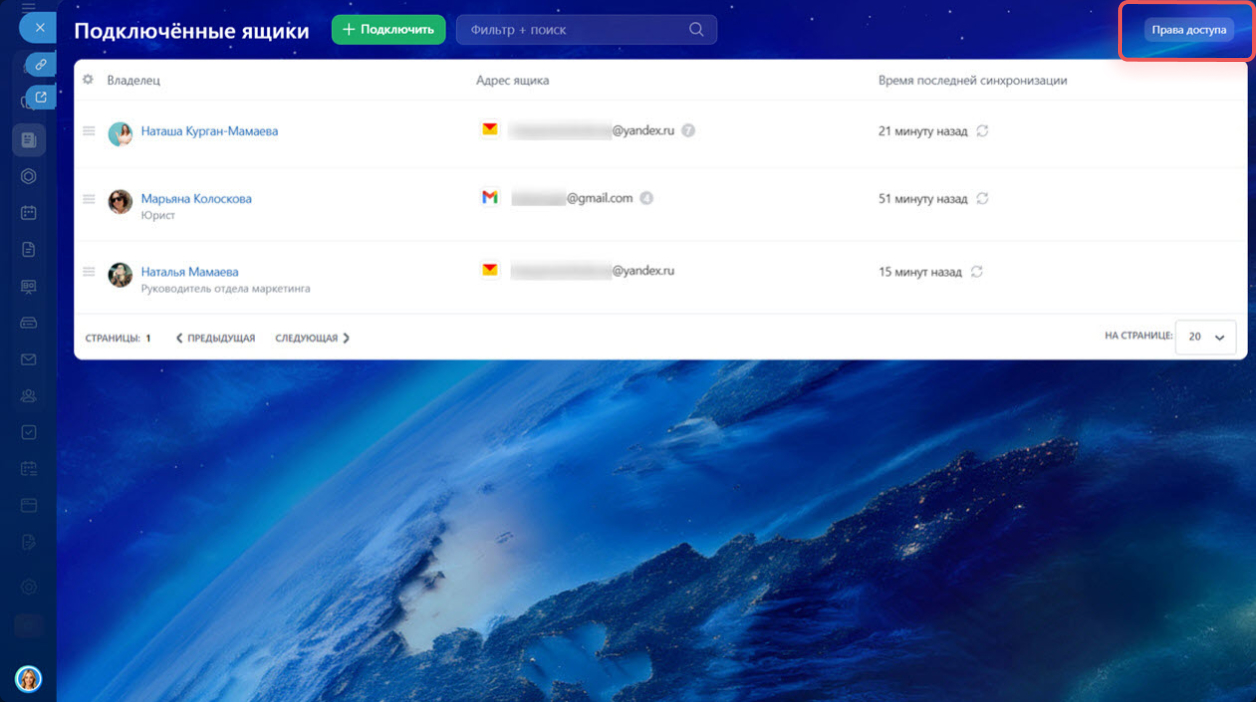 Настроить права доступа. Выберите, кто из пользователей будет видеть список подключенных ящиков, просматривать или изменять настройки. Например, менеджер сможет просматривать список подключенных почтовых ящиков своих коллег, но не сможет менять настройки.