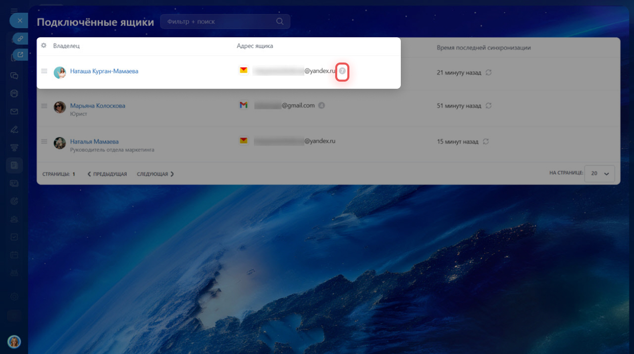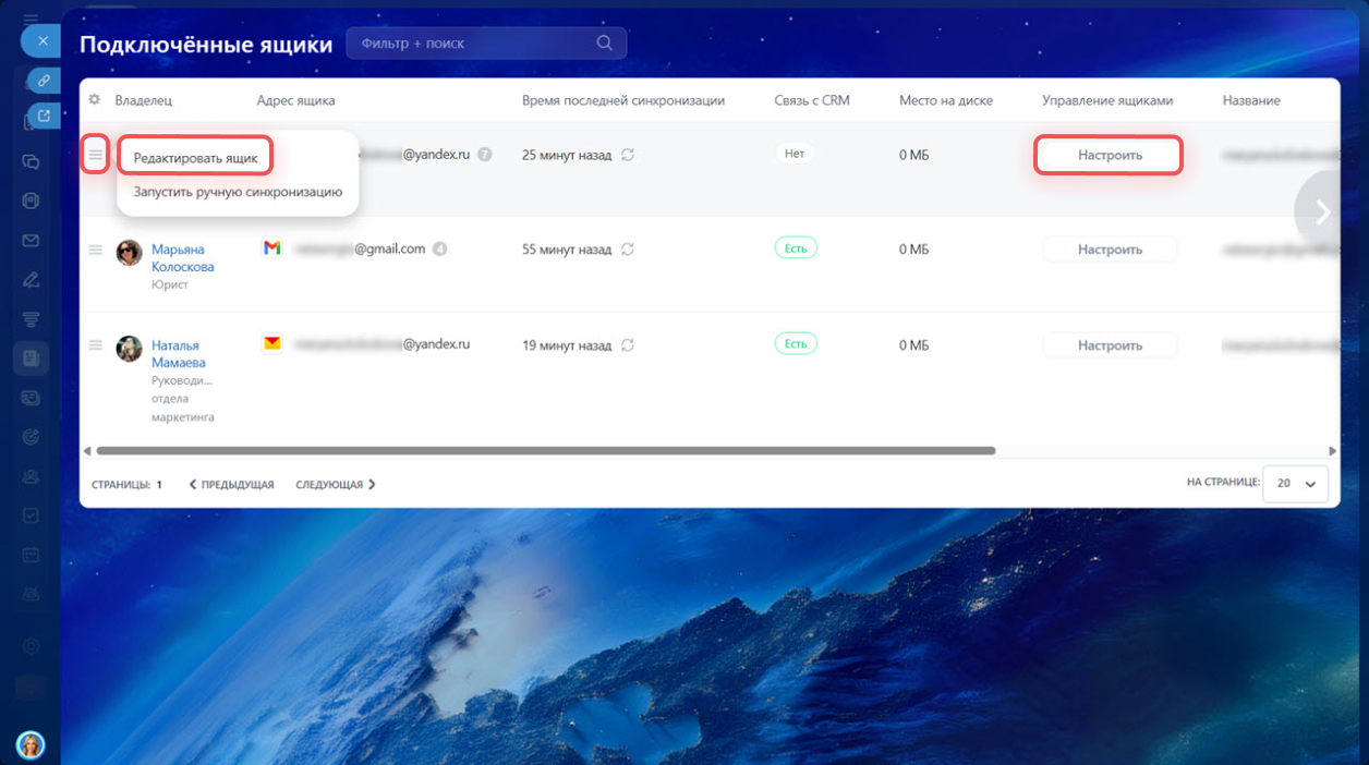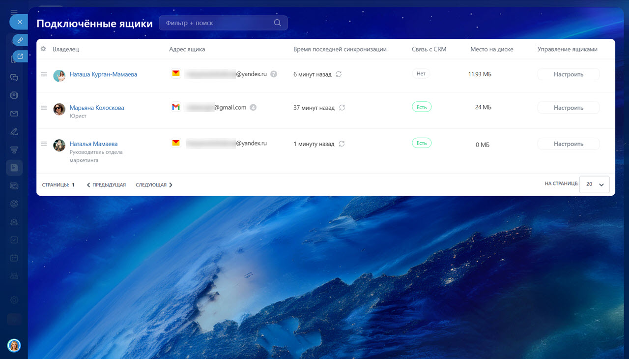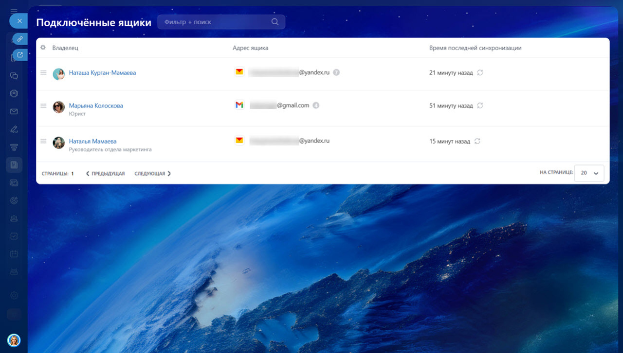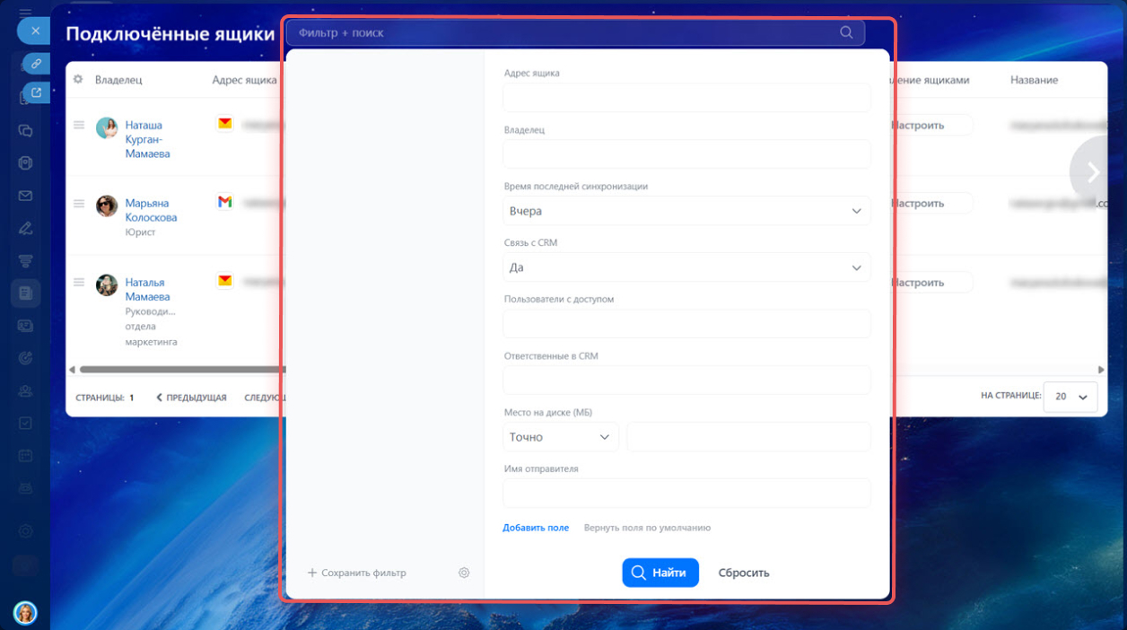 Если в компании подключено много почтовых ящиков, искать нужный вручную неудобно. Фильтры помогают быстро находить данные без пролистывания всего списка. Например, можно показать только ящики, у которых включена интеграция с CRM, или те, что давно не синхронизировались.