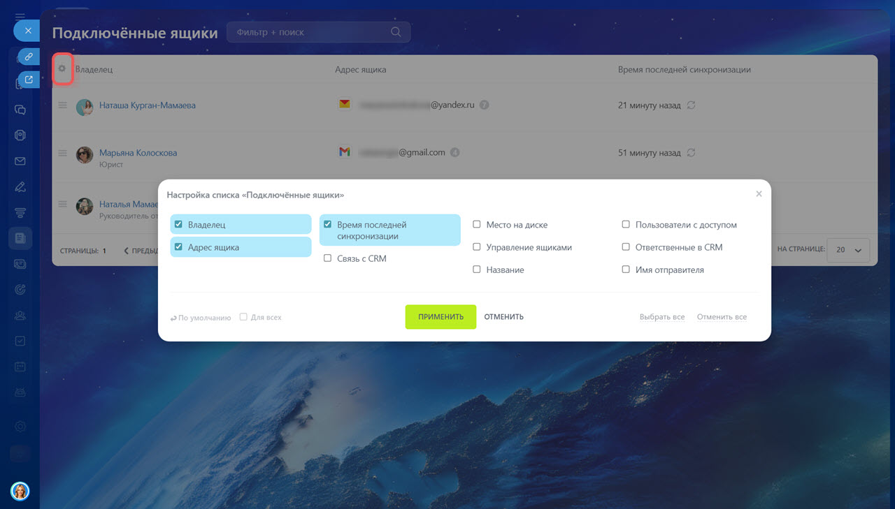 В разделе Управление ящиками сотрудников отображается список всех подключенных почтовых ящиков компании. Чтобы было удобно работать с этим списком, настройте, какие данные показывать в таблице.