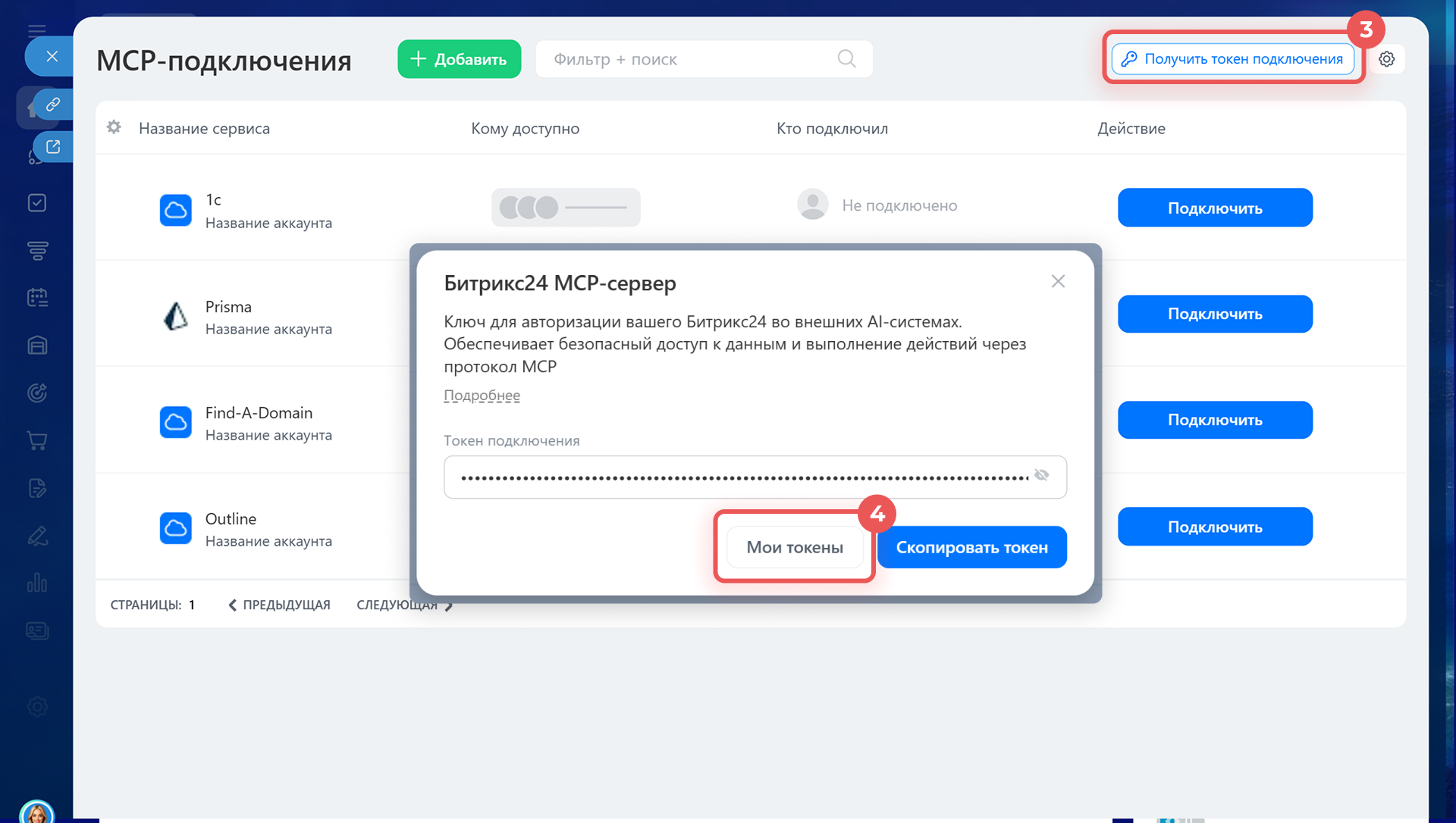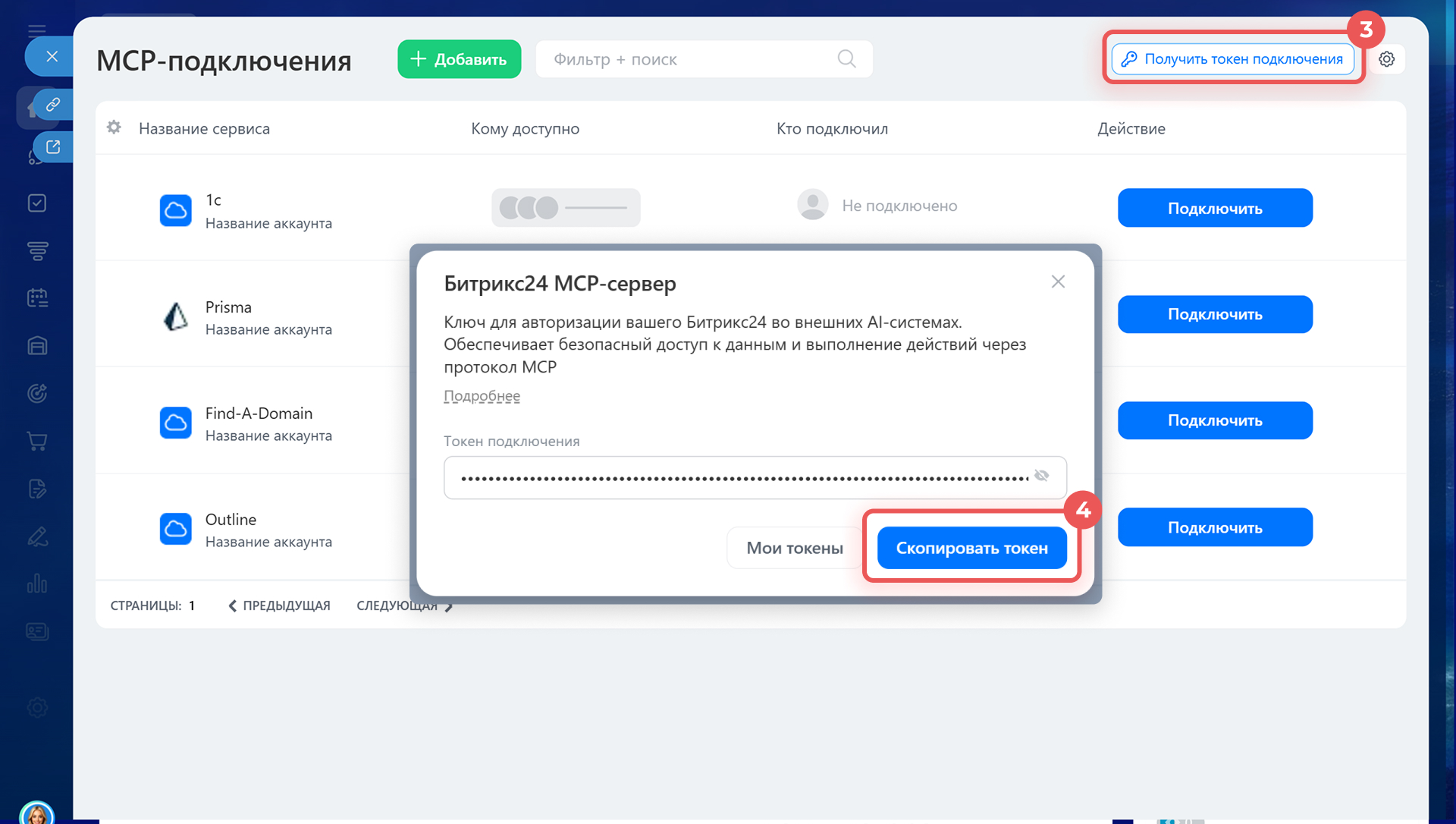 https://mcp.bitrix24.tech/mcp/. - Для настройки интеграции с помощью токена нажмите Приложения > MCP-подключения > Получить токен подключения > Скопировать токен и укажите его при подключении.