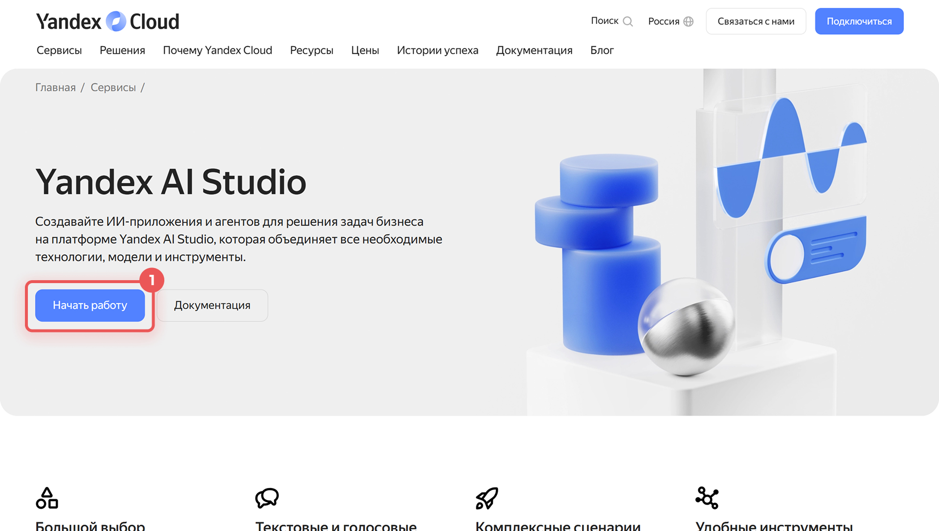 1. Откройте Yandex AI Studio и нажмите Начать работу.