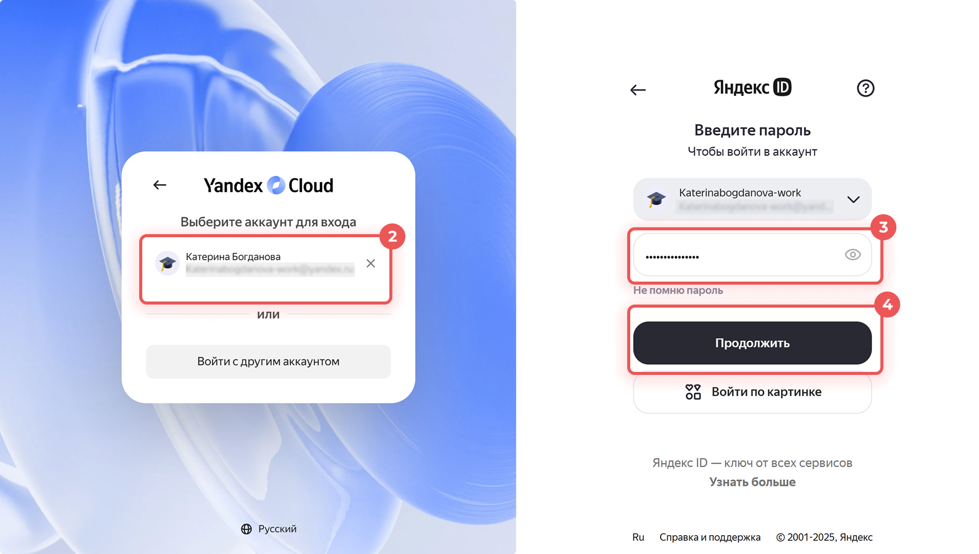 2–4. Выберите аккаунт и способ авторизации, нажмите Продолжить.