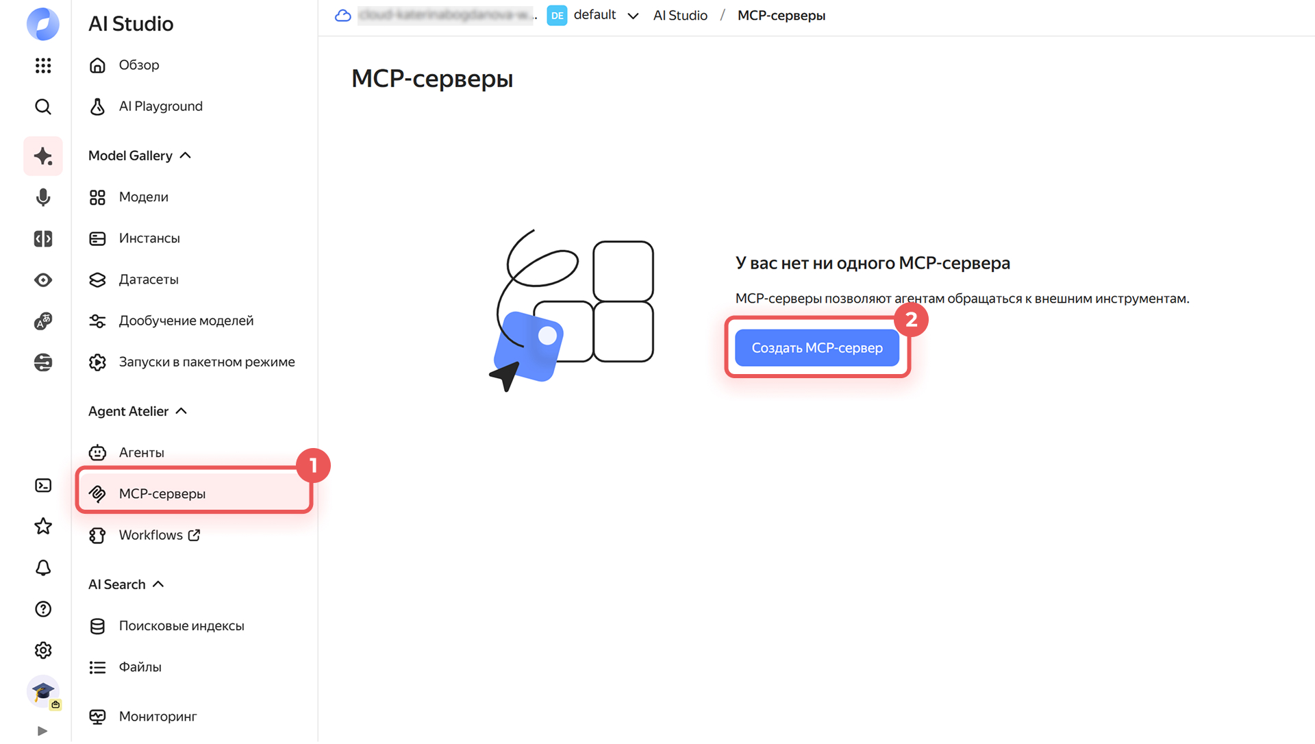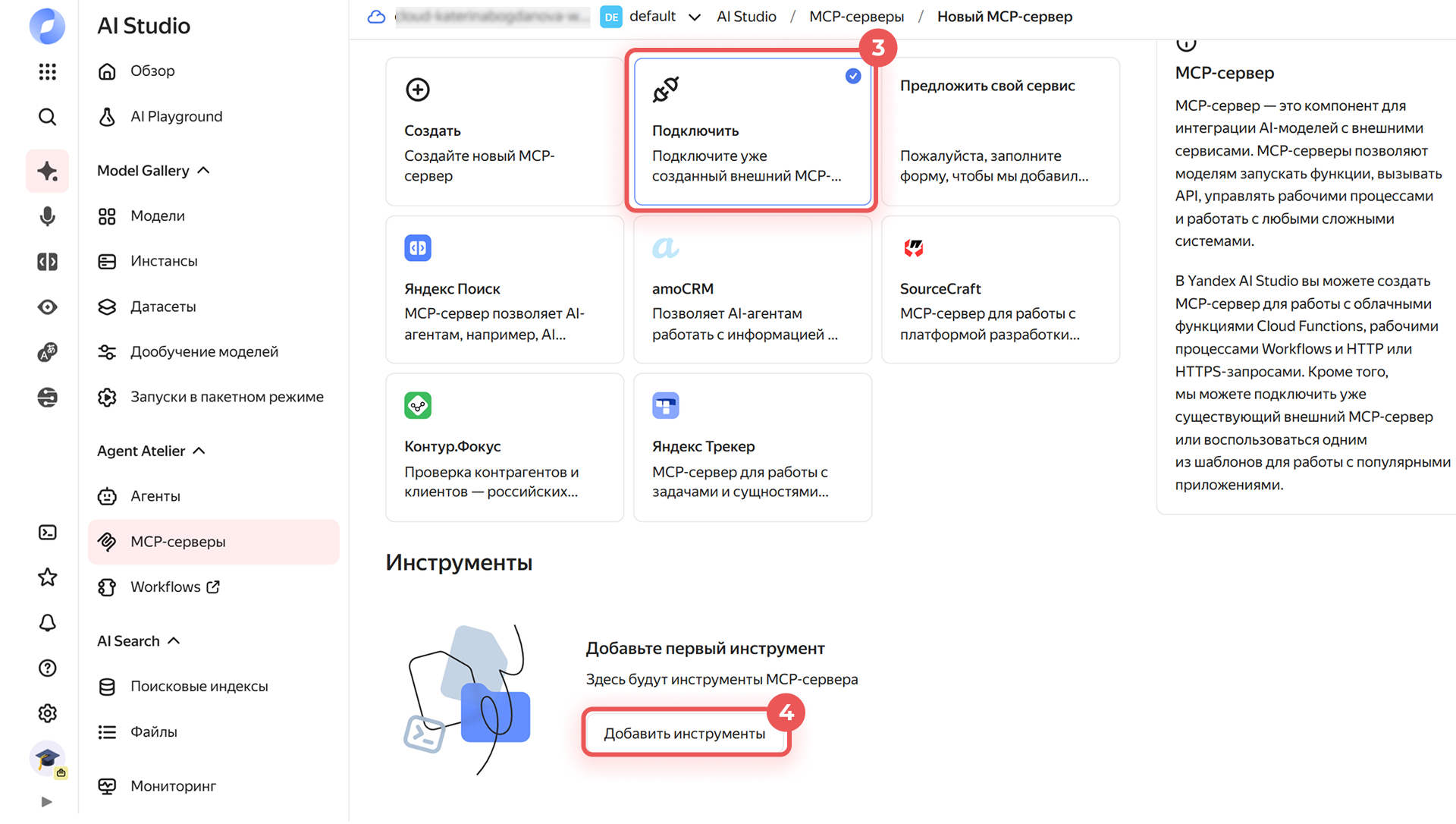 1–4. Нажмите MCP-серверы > Создать MCP-сервер > Подключить > Добавить инструменты.