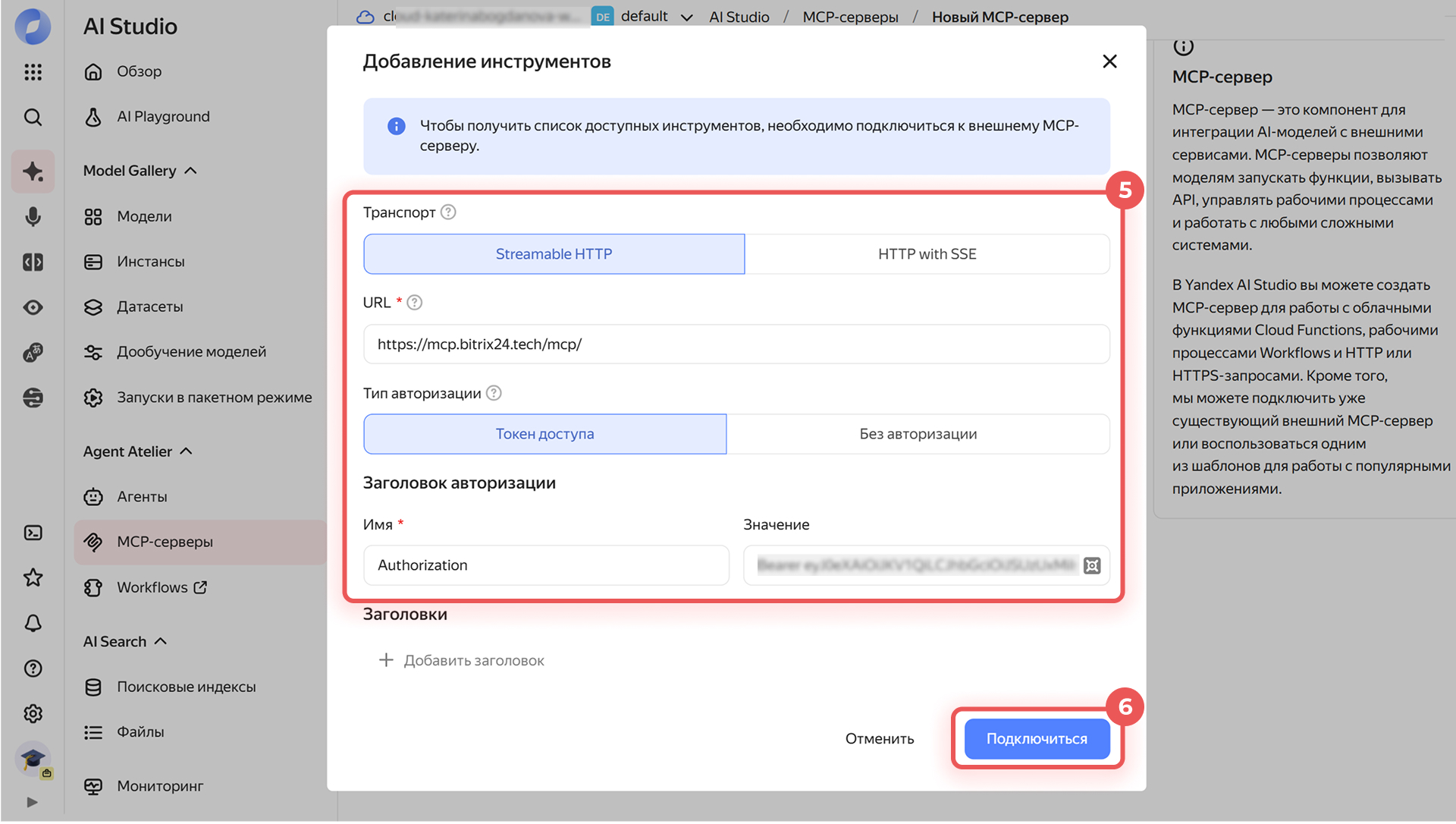 https://mcp.bitrix24.tech/mcp/. - Тип авторизации — токен доступа.
