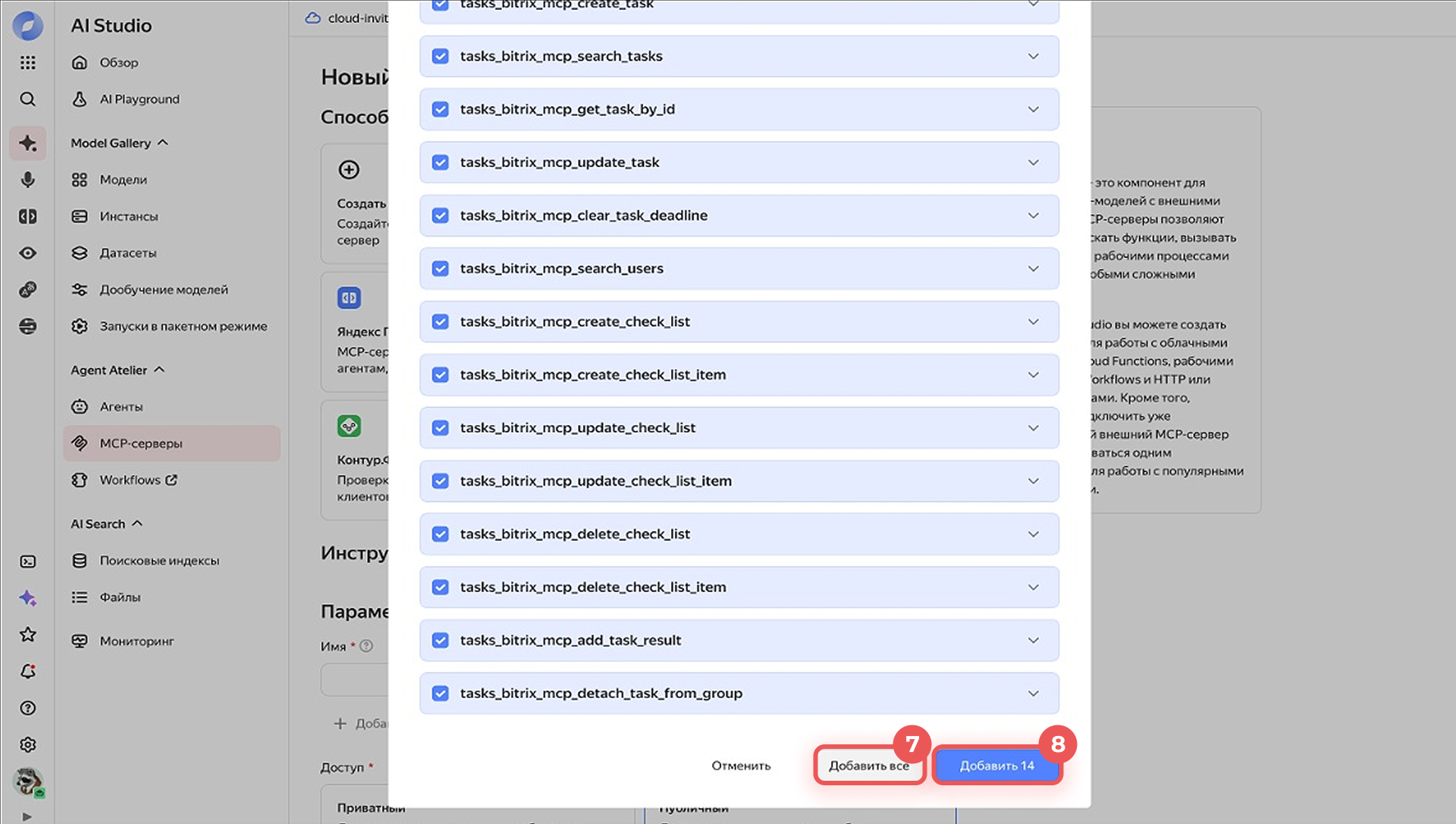7. Выберите конкретные действия или нажмите Добавить все, чтобы управлять всеми доступными инструментами Битрикс24 с помощью внешней AI-системы. Например, ставить задачи, добавлять в них чек-листы, менять исполнителя.