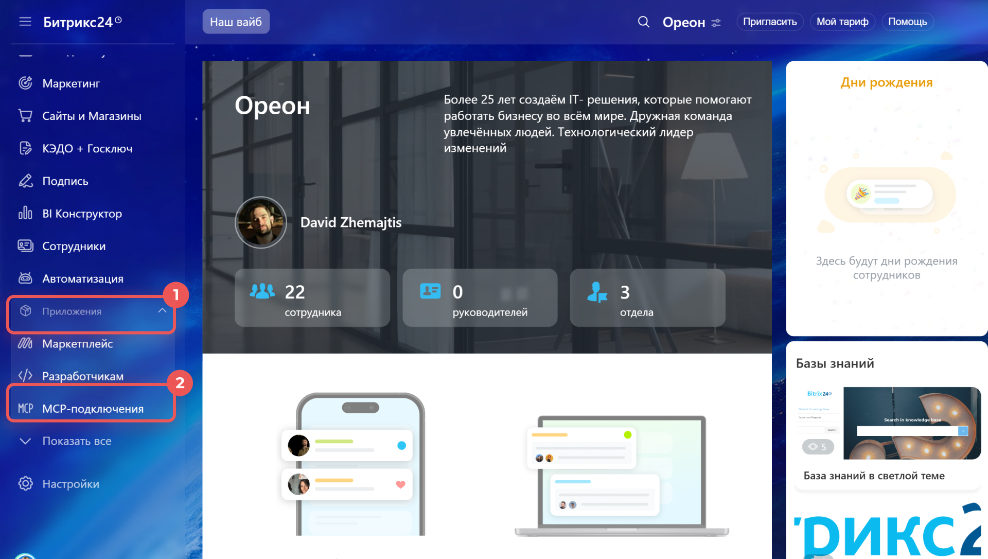 1–2. Перейдите в раздел Приложения > MCP-подключения.