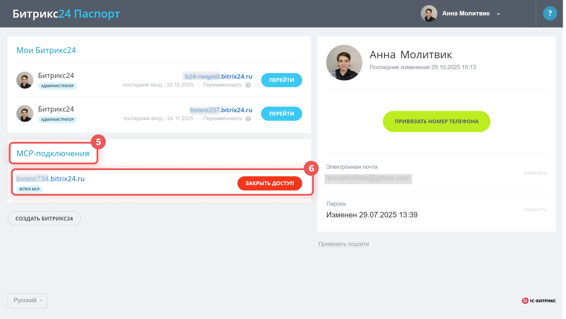 - Вы можете отключить свой Битрикс24 от внешней AI-системы. Нажмите Приложения > MCP-подключения > Получить токен подключения > Мои токены. Найдите в Битрикс24 Паспорт нужное подключение в блоке MCP-подключения и нажмите Закрыть доступ.