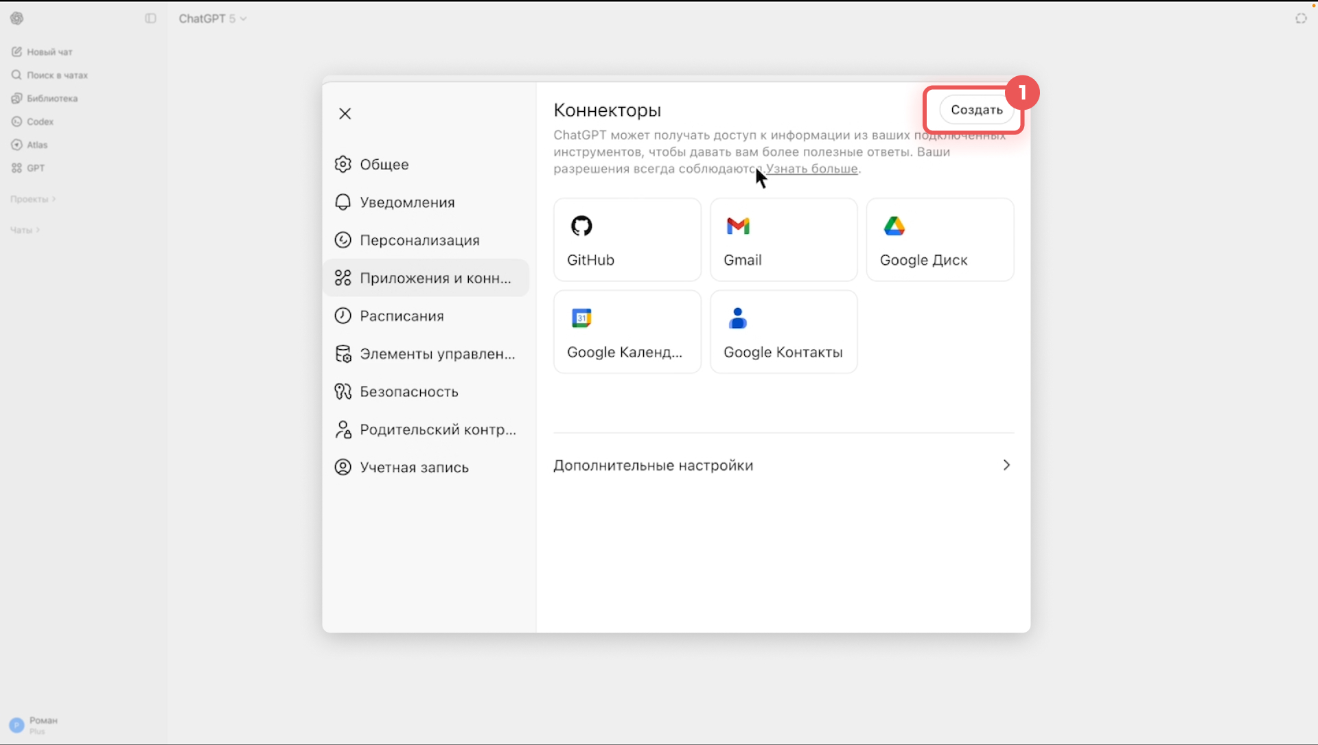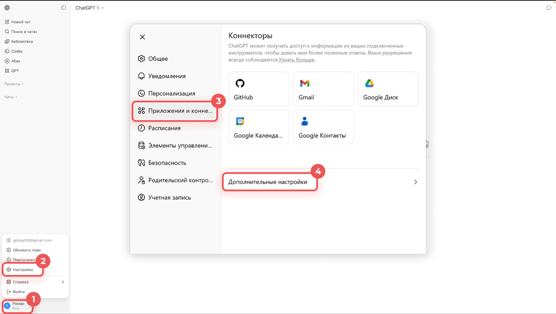2–4. Нажмите Настройки (⚙️) > Приложения и коннекторы > Дополнительные настройки.