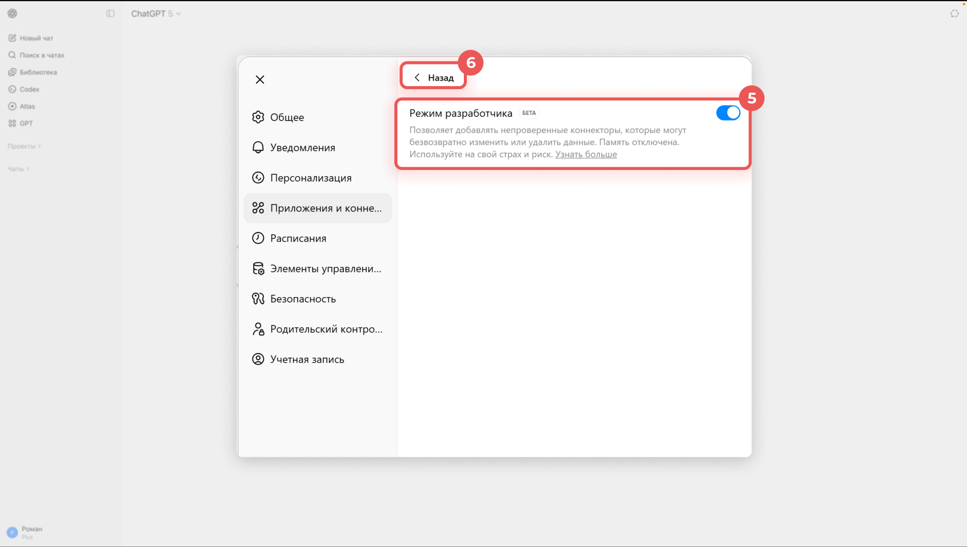 5–6. Включите опцию Режим разработчика и нажмите Назад для возврата к списку коннекторов.