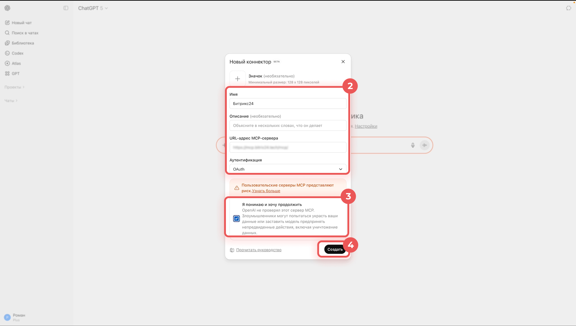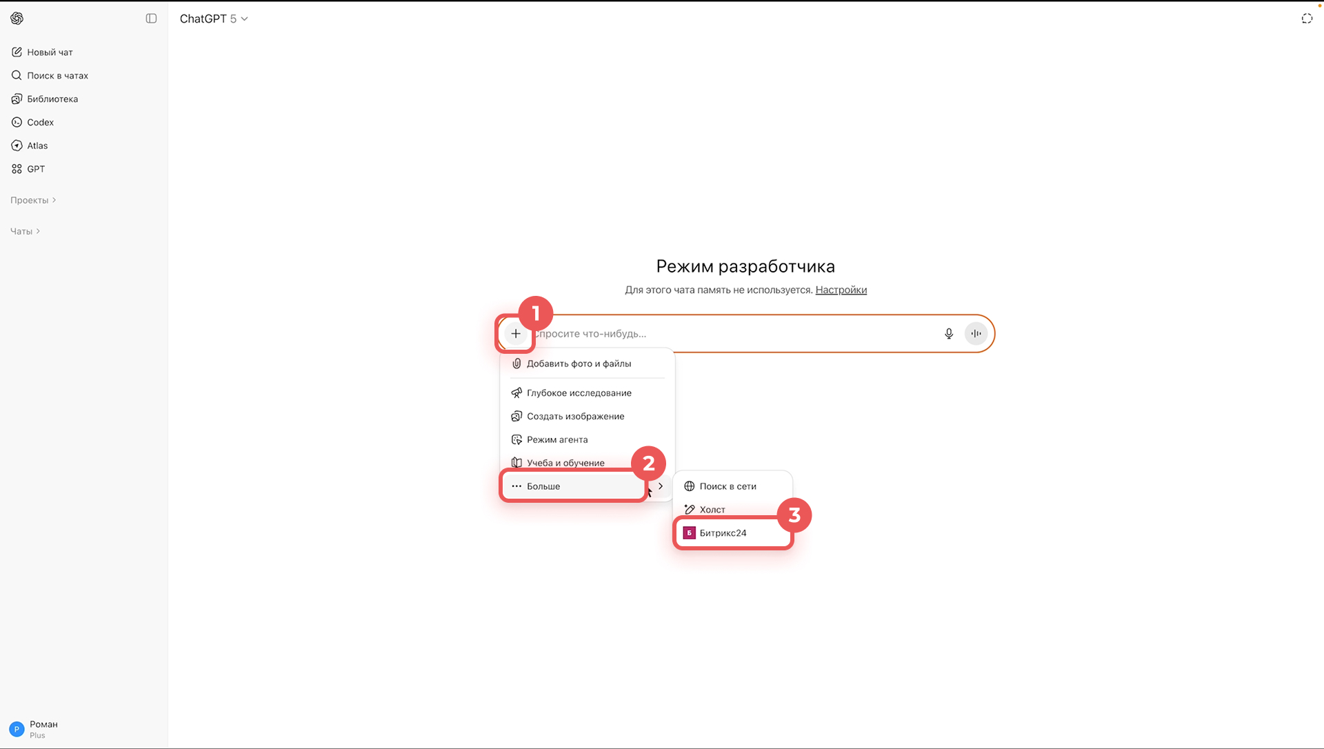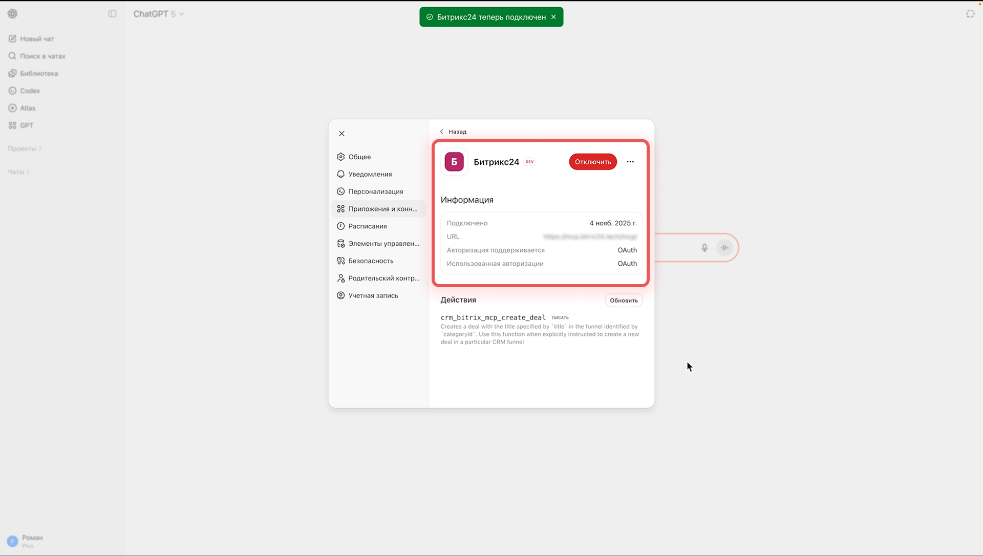 Расскажем о подключении на примере интеграции Битрикс24 с ChatGPT. Настройка доступна в подписках ChatGPT Plus и Pro.