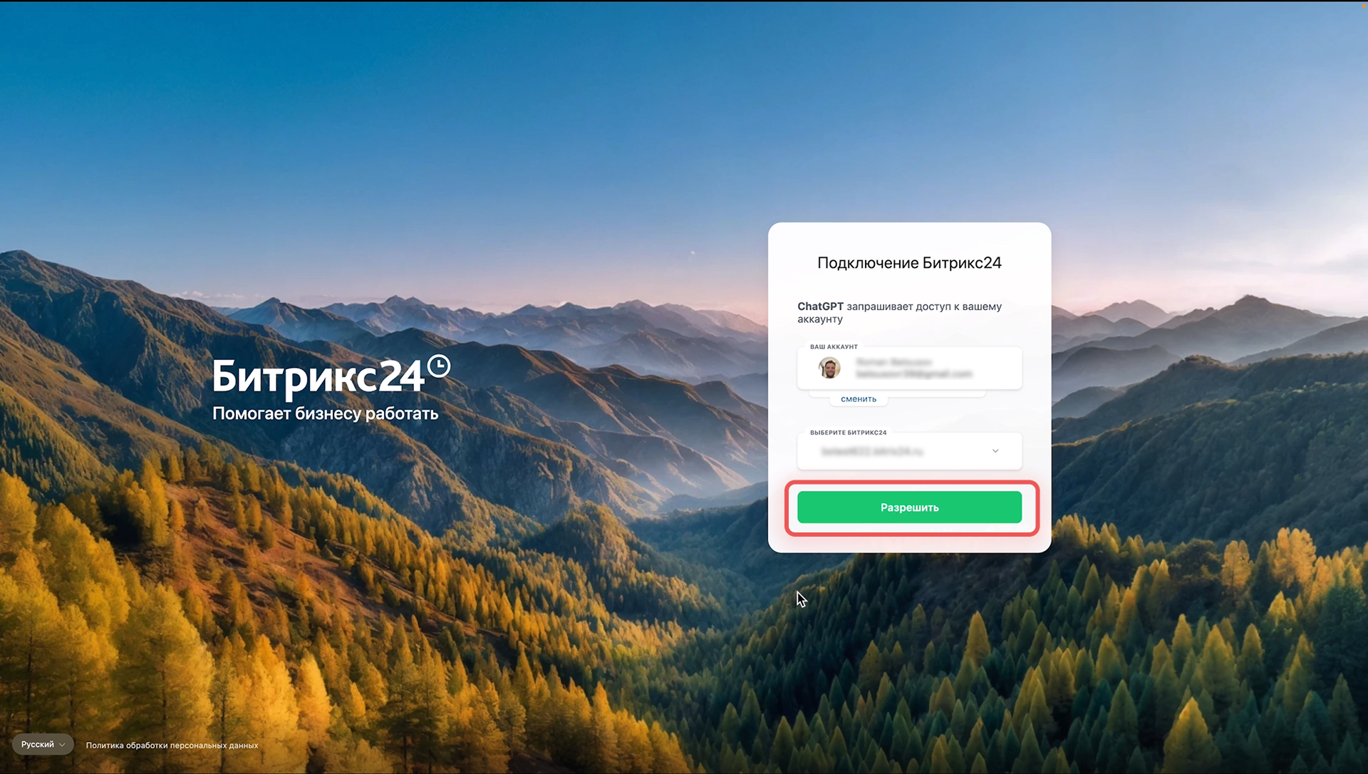 Авторизоваться в Битрикс24. Войдите в свой аккаунт — Битрикс24 подключится к ChatGPT, и вы сможете управлять инструментами из чата с AI-ассистентом.
