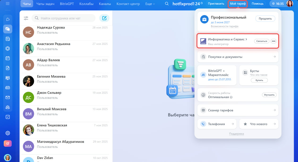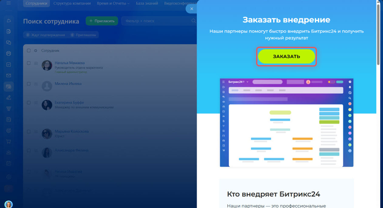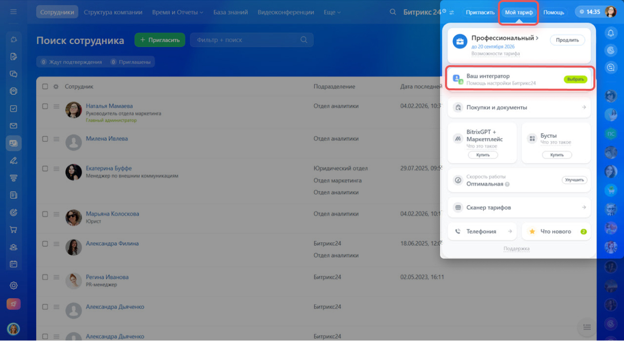 - Если в вашем Битрикс24 нет интегратора, мы можем помочь с выбором. Оставьте заявку на внедрение — нажмите Мой тариф > Выбрать.