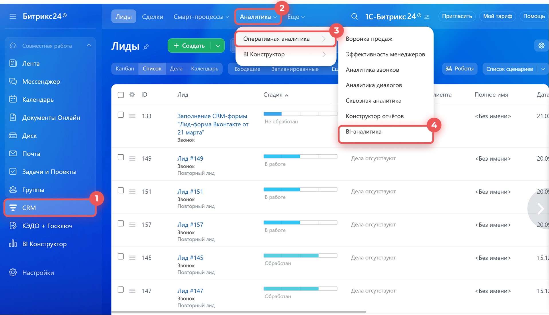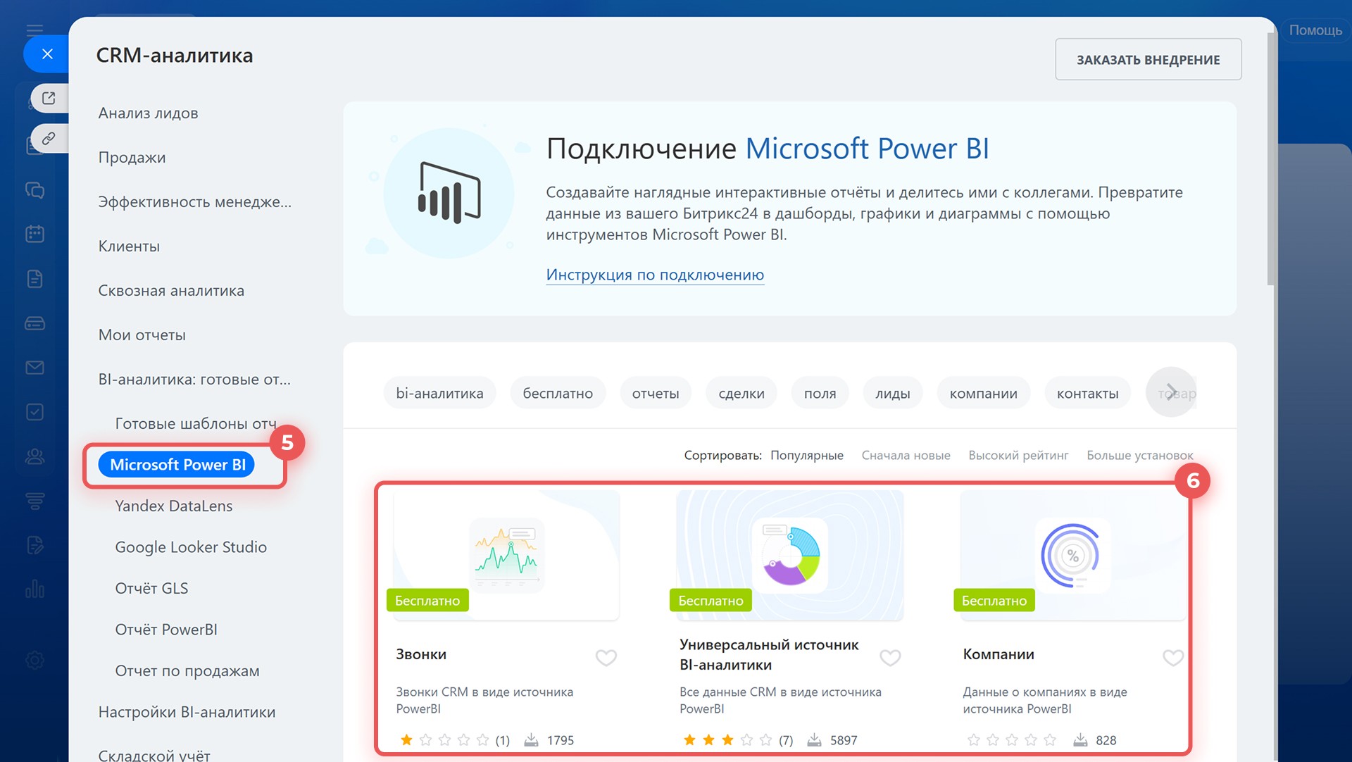 Откройте раздел CRM > Аналитика > Оперативная аналитика > BI-аналитика > Microsoft Power BI и скачайте шаблон.