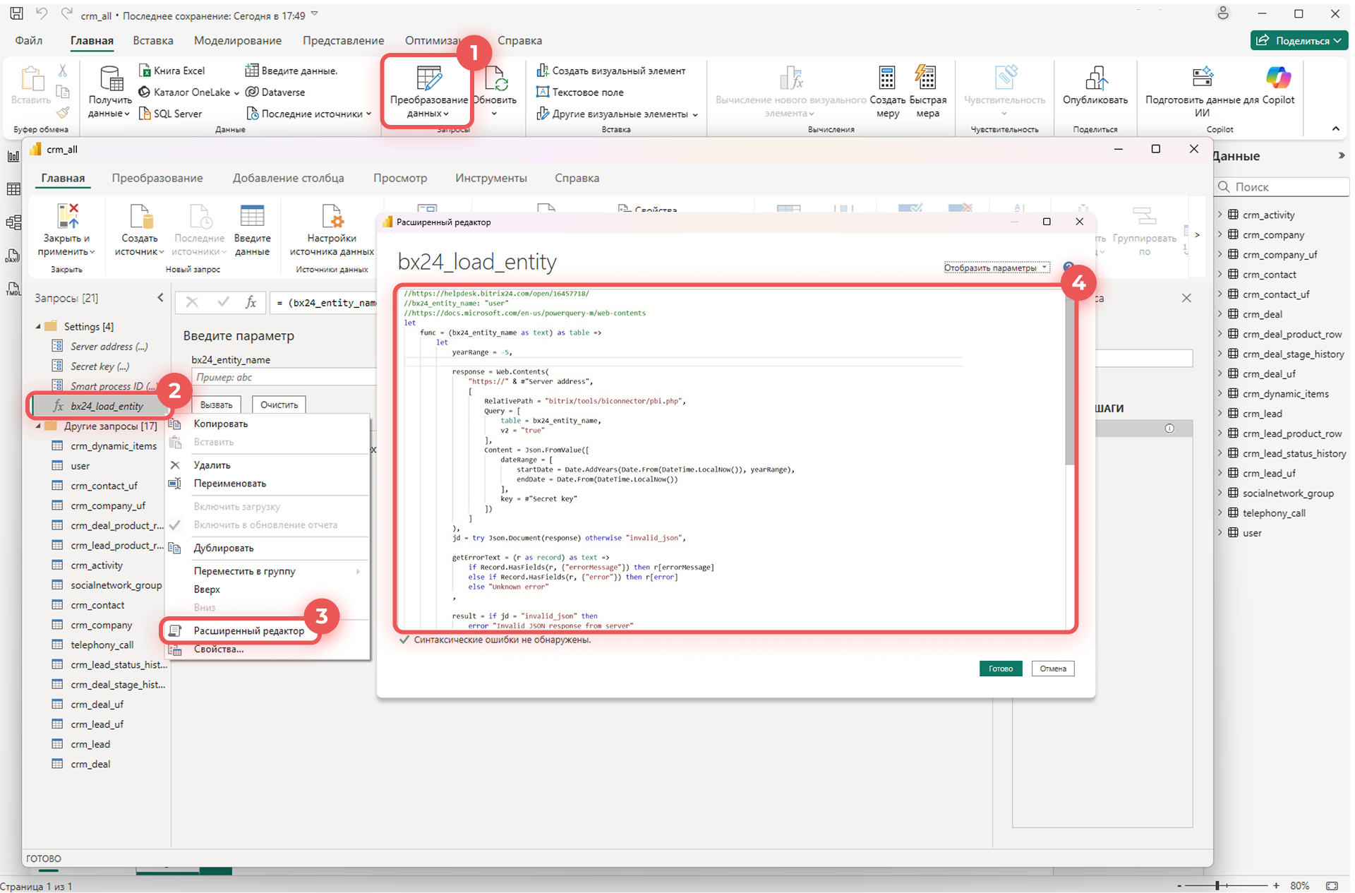 4. Скопируйте весь код из этого запроса и вставьте его в рабочий отчет в запрос b24_load_entity.