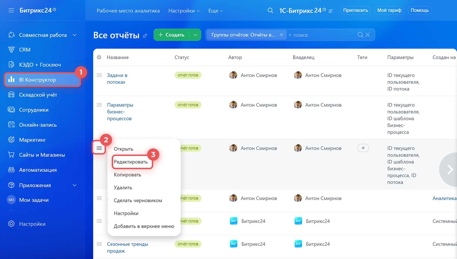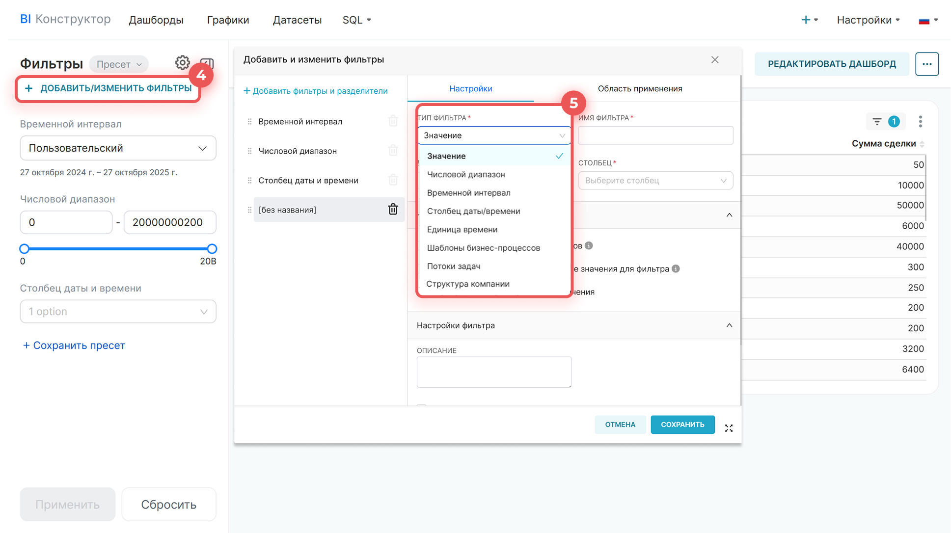 Чтобы добавить фильтры, откройте нужный отчет в разделе BI Конструктор и нажмите Редактировать. В панели слева выберите Добавить/изменить фильтры, укажите нужный тип, название и другие настройки.