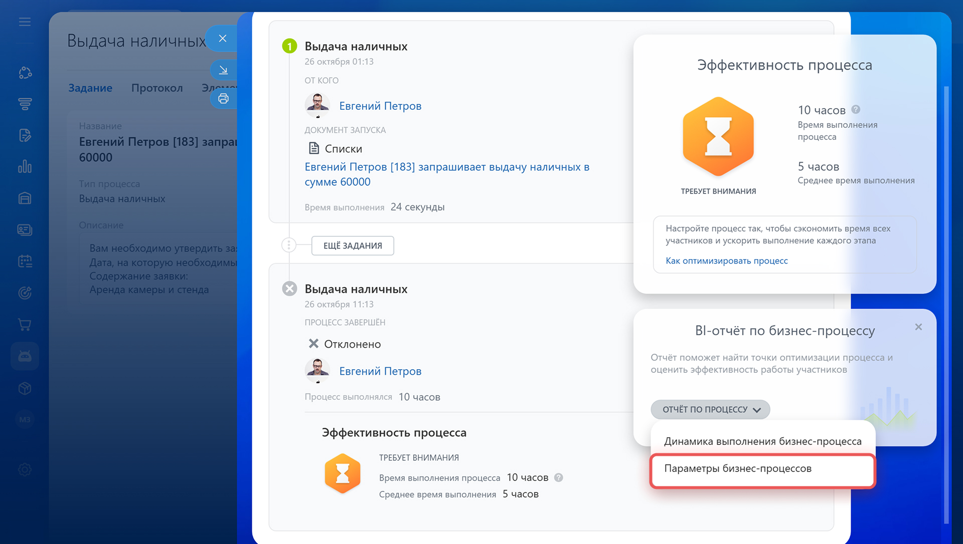 - фильтры по параметрам и структуре компании — помогают увидеть данные по определенным сотрудникам, потоку задач или шаблону бизнес-процесса,