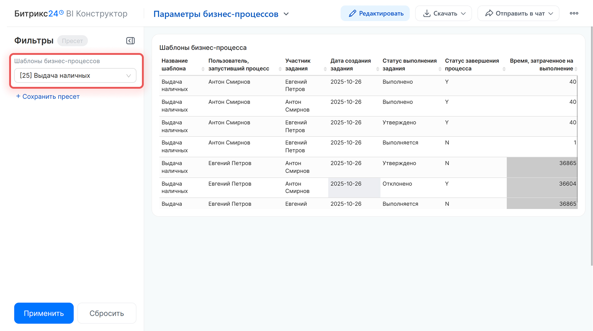 Фильтры позволяют управлять данными в отчетах: ограничивать период, выбирать нужные потоки, сотрудников или шаблоны бизнес-процессов. Рассмотрим, как с ними работать: