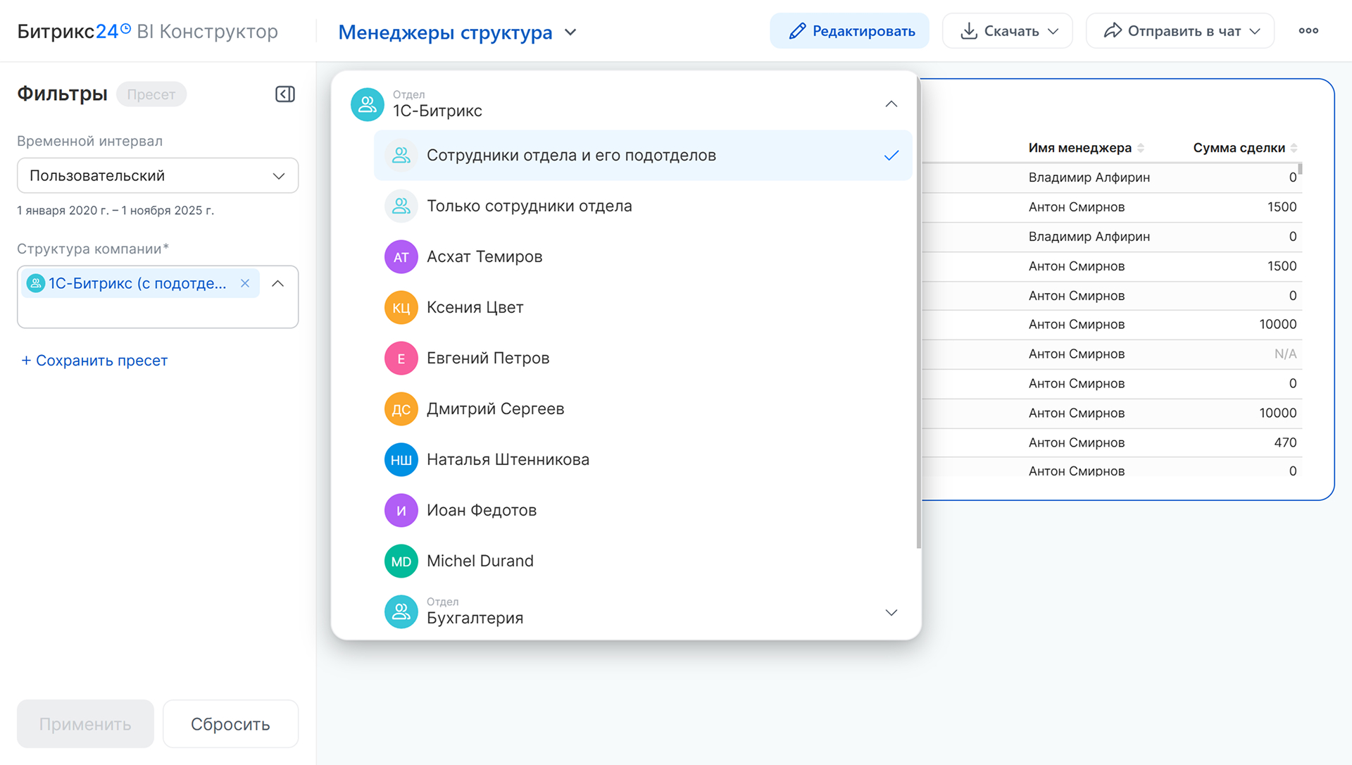 Фильтр по структуре компании. Позволяет анализировать данные по отделам и сотрудникам. Работает как селектор сотрудников в Битрикс24: можно выбрать отдел, всех сотрудников подразделений или конкретных людей. Например, руководитель может выбрать отдел маркетинга и посмотреть нужные показатели в отчете. Это удобнее, чем создавать отдельный отчет для каждого подразделения.