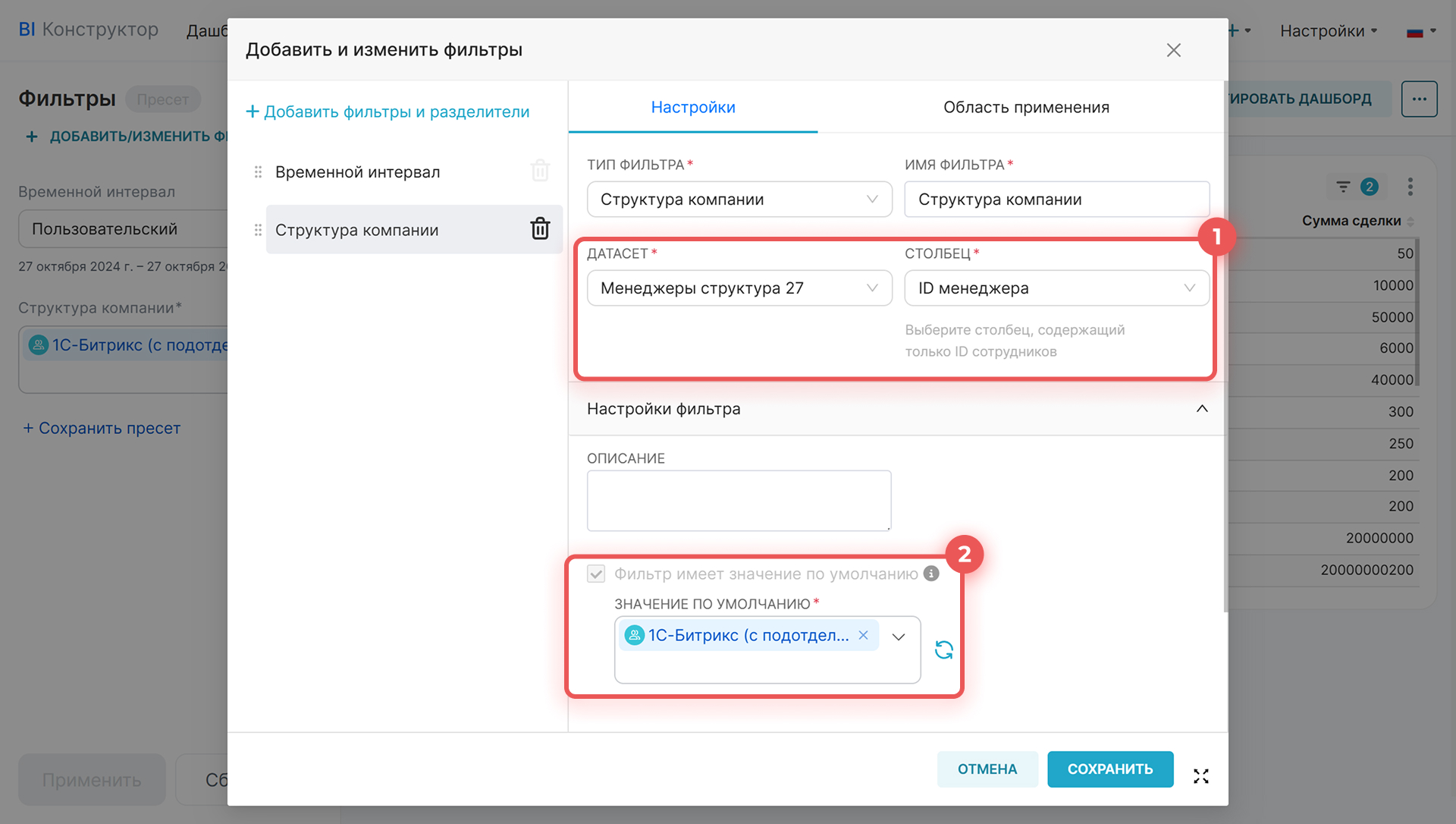 - Выбрать датасет, в котором есть поле, содержащее только идентификаторы сотрудников, и указать это поле в настройках фильтра,
