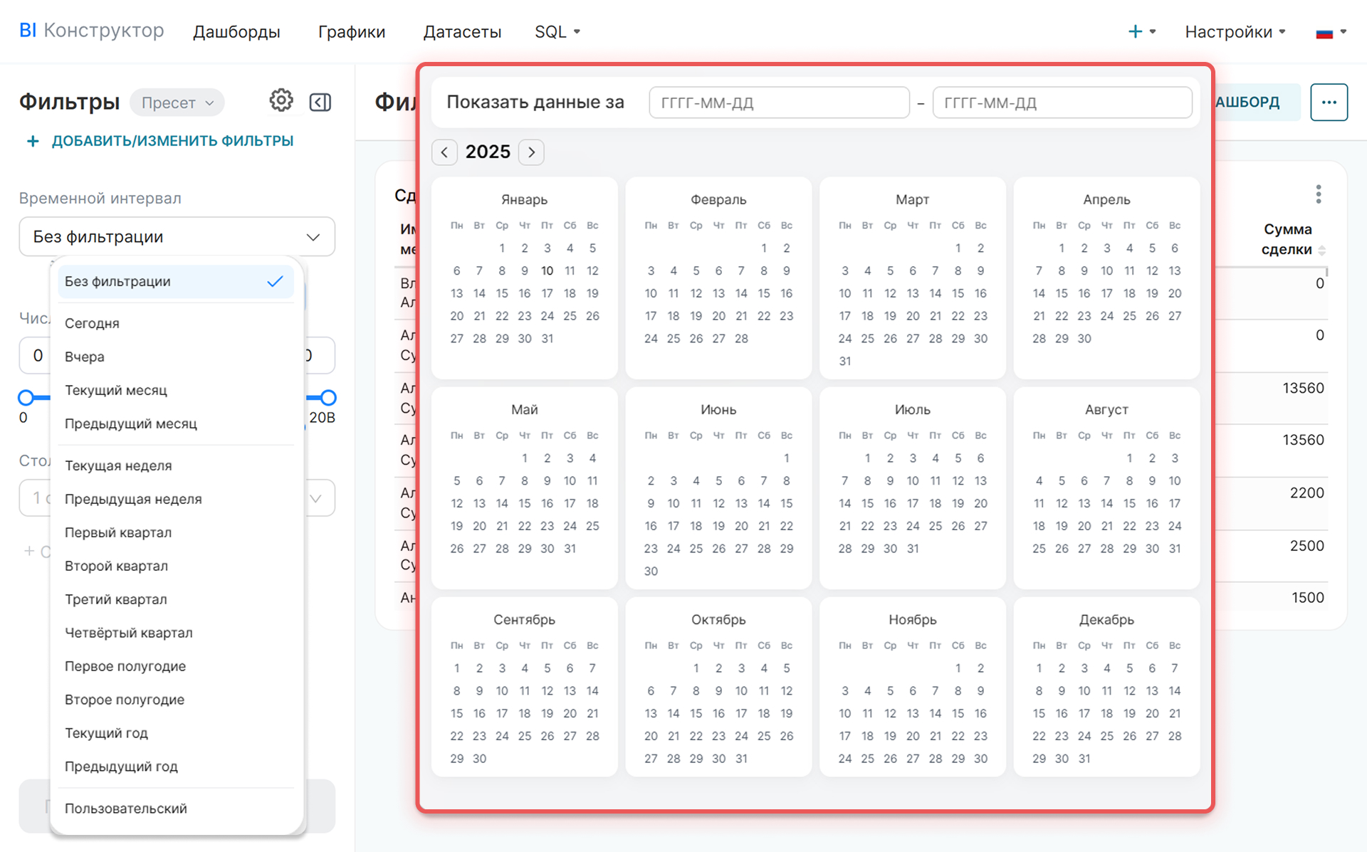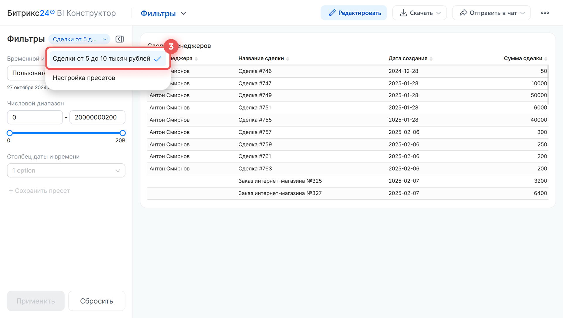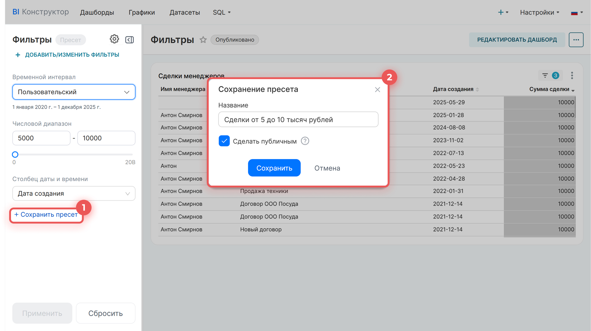 Пресеты — это сохраненные наборы фильтров. Они помогают не настраивать фильтры заново каждый раз. Создатель отчета может выбрать нужные параметры — период, сотрудников или сумму сделки — и сохранить их как пресет. Пользователи выбирают набор из списка, и отчет сразу перестраивается с нужными условиями.