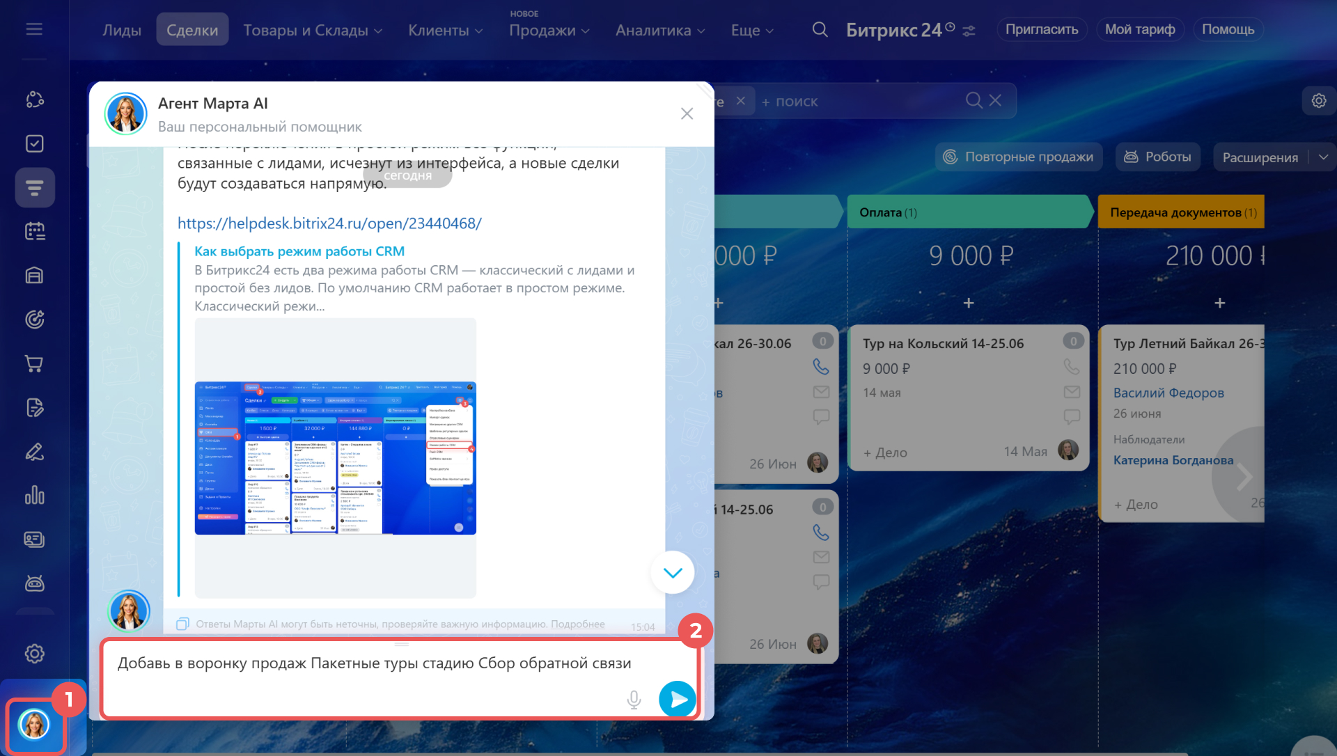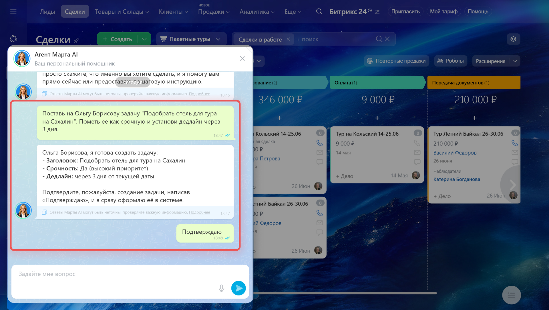 - В чате с Мартой AI можно управлять инструментами Битрикс24. Напишите, что нужно сделать, персональный помощник уточнит детали, запросит подтверждение действий и выполнит их.