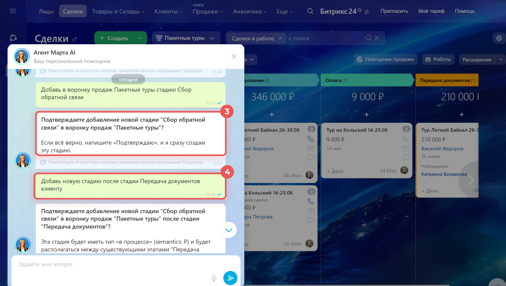 4. При необходимости дополните запрос. Например, укажите, какой по счету должна быть новая стадия, или попросите ее переименовать.