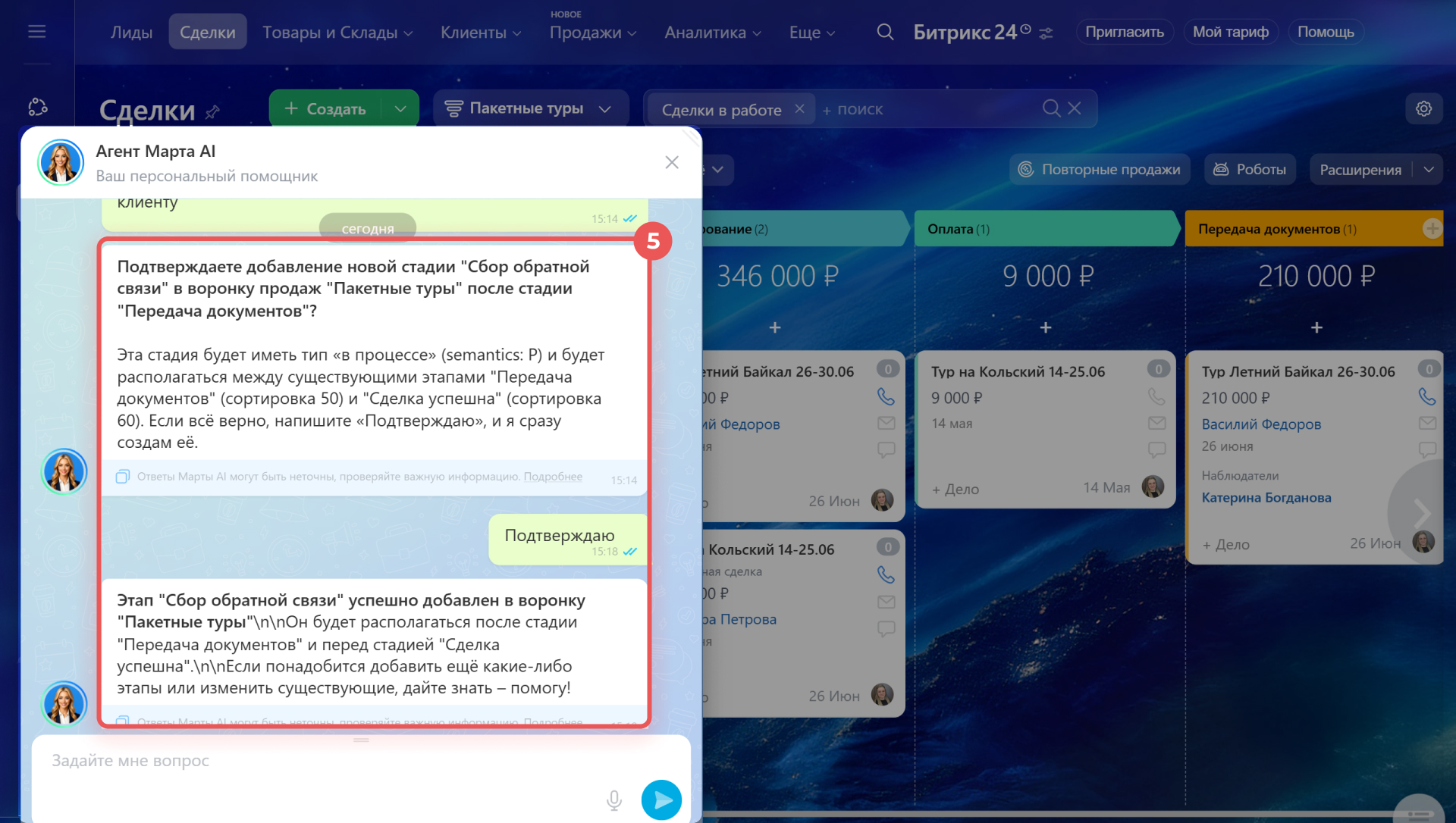 3. Агент Марта уточнит детали и запросит подтверждение действий.