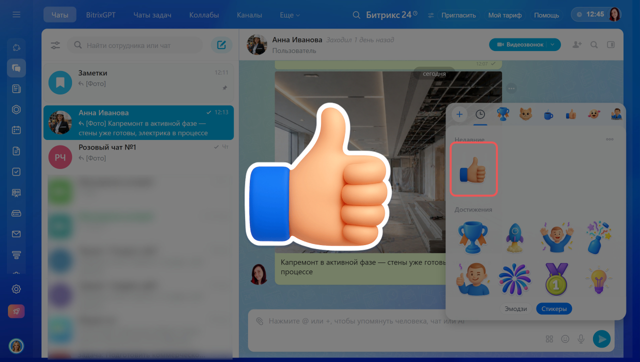 - В мессенджере Битрикс24 можно использовать стикеры — привычный и быстрый способ оживить рабочее общение. Вы можете отправить их вместо «ок» или «спасибо», поддержать коллегу или просто добавить эмоций в чат.