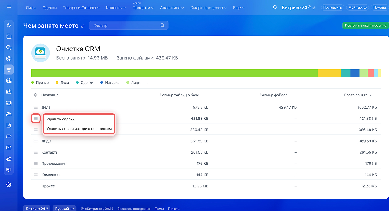 Когда в Битрикс24 заканчивается место, новые лиды, сделки, контакты и другие элементы не создаются. Инструмент Очистка CRM помогает быстро найти, что занимает место, и удалить лишние данные — например, старые сделки или лиды.