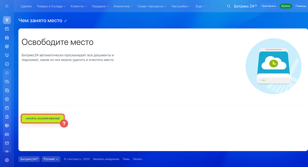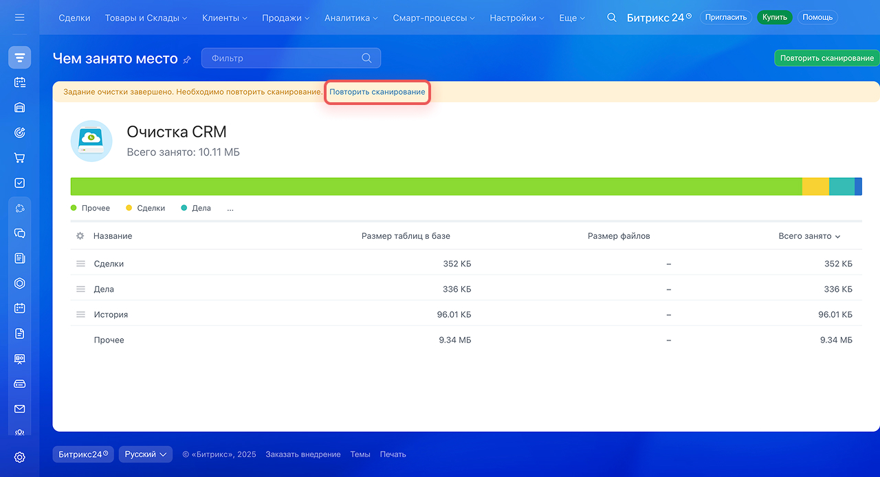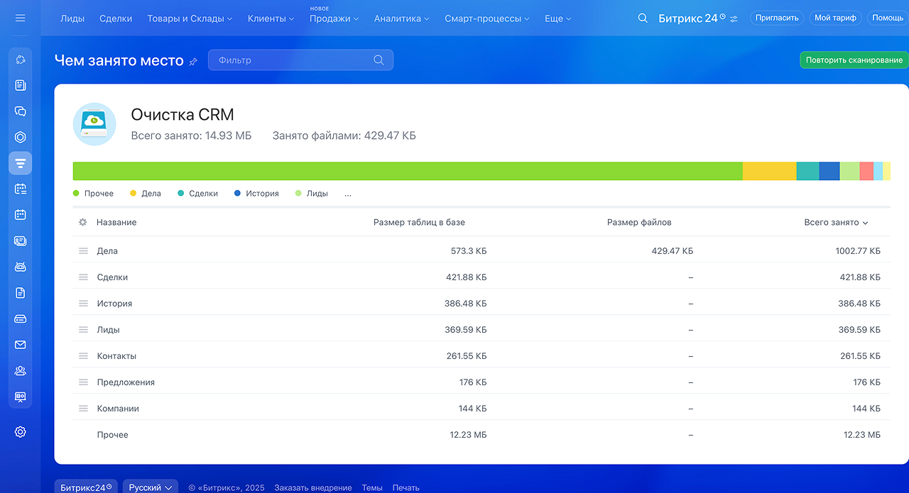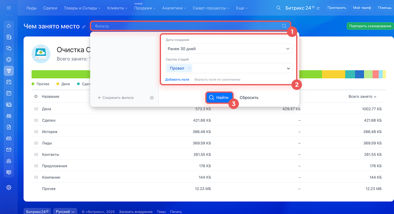 - С помощью инструмента Очистка CRM можно быстро найти, что занимает место, и удалить лишние данные.