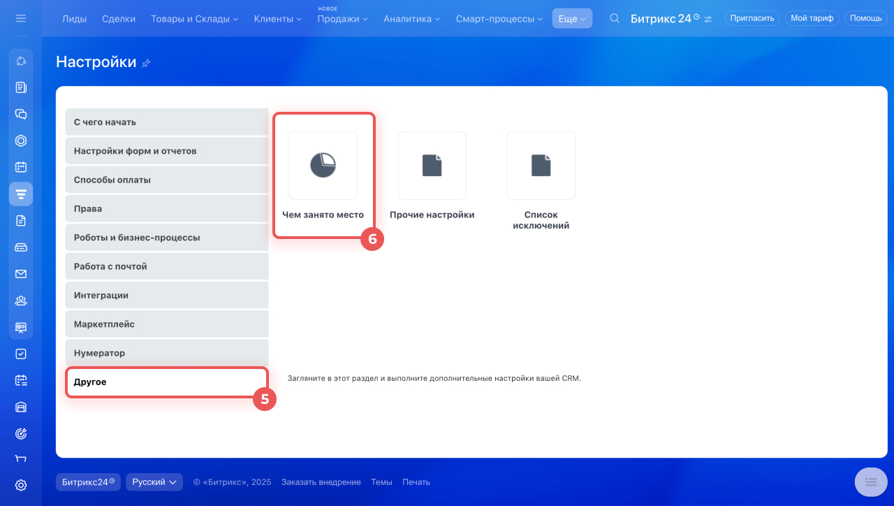 - Чтобы открыть инструмент Очистка места, перейдите в CRM > Еще > Настройки > Настройки CRM > Другое > Чем занято место.
