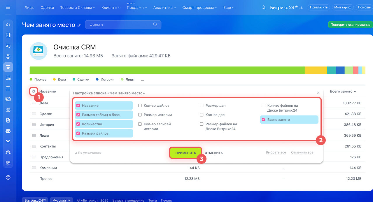 Вы можете выбрать, какие колонки показывать в таблице. Это поможет точнее определить, какие разделы занимают больше всего места, и выбрать, что очистить в первую очередь. Например, сделки с документами или лиды с делами и письмами.