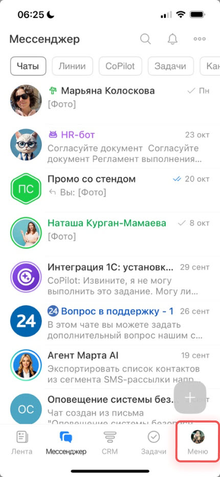 Теперь все дополнительные инструменты собраны в меню, которое открывается по нажатию на вашу аватарку внизу экрана. Здесь вы можете управлять рабочим временем, чекиниться, открывать профиль, документы, настройки и быстро перейти в другой аккаунт.