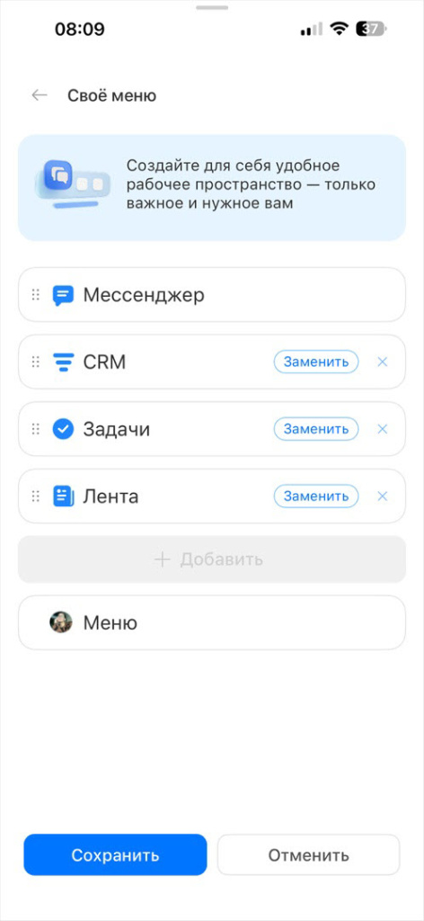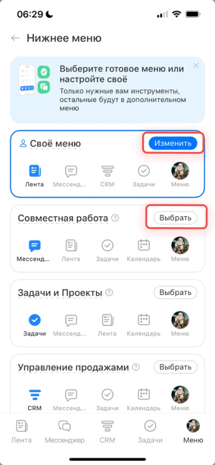 Можно выбрать готовое меню или создать свое. Например, если вы ежедневно обсуждаете рабочие вопросы в чатах и следите за новостями в ленте, выберите меню Совместная работа.