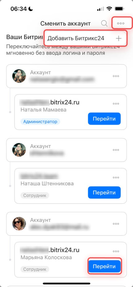 - перейти в другой Битрикс24 — нажмите Перейти,