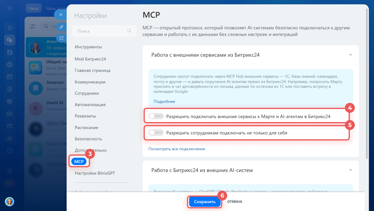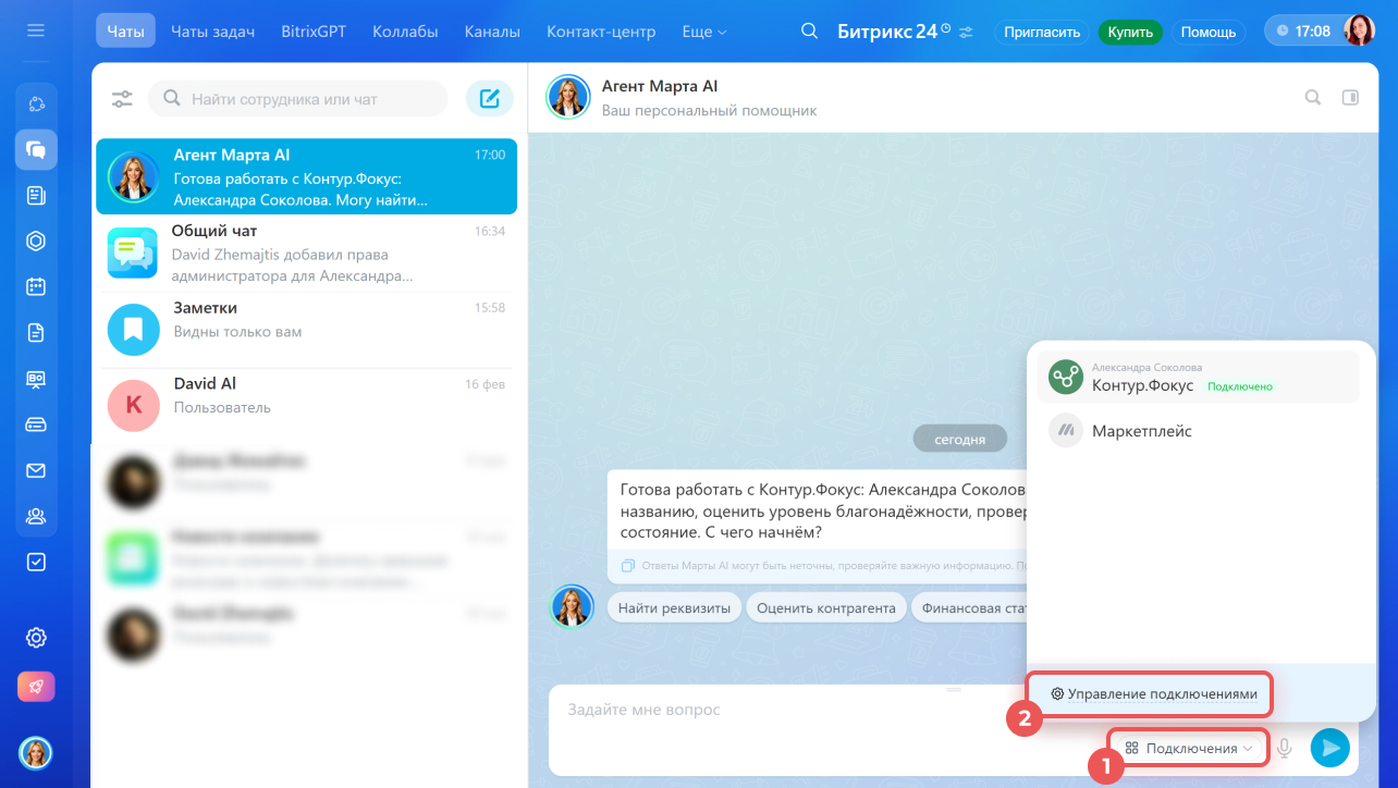 - Администратор Битрикс24 может управлять всеми подключенными сервисами в менеджере внешних MCP-серверов. В чате с Агентом Мартой нажмите Подключения > Управление подключениями.
