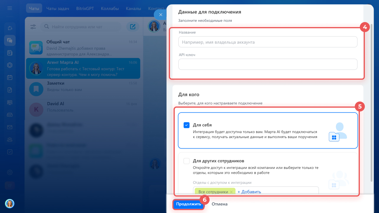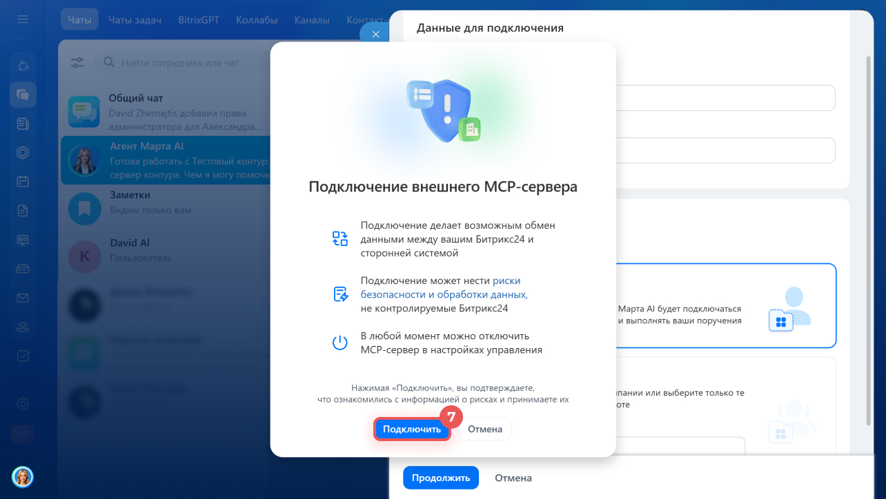 - Чтобы подключить внешний MCP-сервер, откройте чат с Мартой AI или другим AI-агентом и нажмите Подключения в поле ввода сообщения. Выберите сервис, введите данные для подключения и укажите, кому он будет доступен — только вам или другим сотрудникам. Нажмите Продолжить и подтвердите подключение внешнего MCP-сервера.