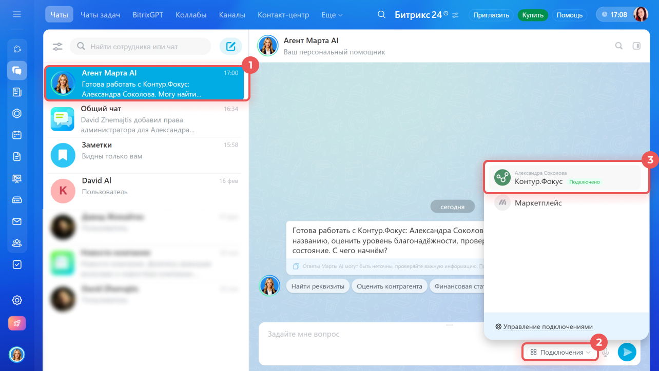 После подключения сотрудник может получать данные из сервисов и выполнять действия одним запросом в чат. Например, подключите Контур.Фокус и попросите Марту AI проверить компанию или найти реквизиты контрагента — агент обратится к сервису и вернет результат в чат.