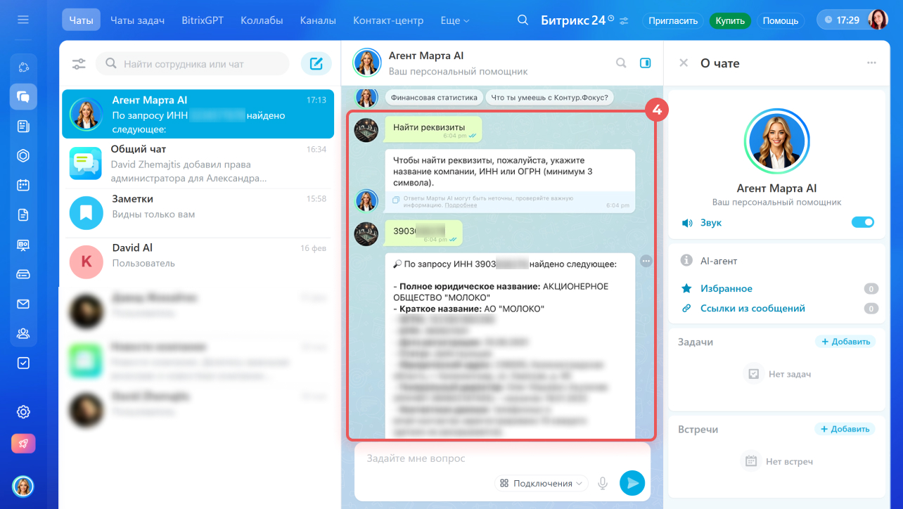4. Напишите в чат поручение Агенту Марта. Например, попросите ее найти реквизиты компании. Персональный помощник уточнит детали, согласует команду и выполнит ее.
