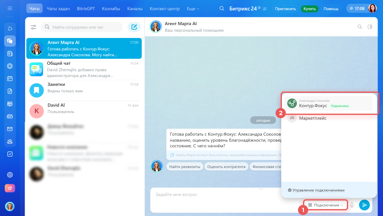 2–3. Нажмите Подключения в поле ввода текста и выберите нужный сервис — например, Контур.Фокус или другой сервис из Маркетплейса.