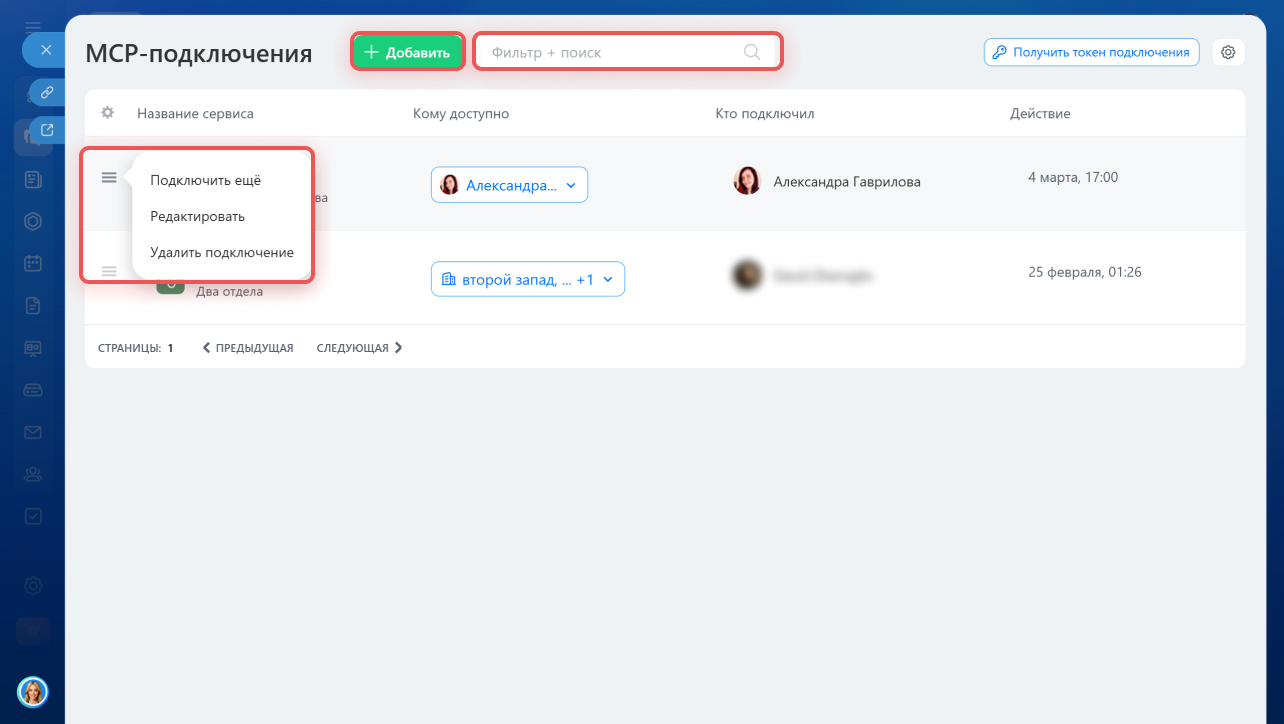 Администратор Битрикс24 может управлять всеми подключенными сервисами в менеджере внешних MCP-серверов. В чате с Агентом Мартой нажмите Подключения > Управление подключениями. Здесь можно: