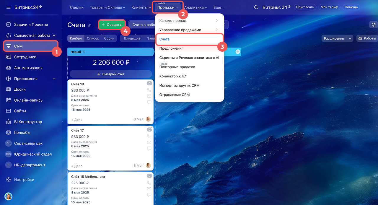Перейдите в CRM > Продажи > Счета и нажмите Создать. В карточке счета в блоке Регулярный счет заполните поля.
