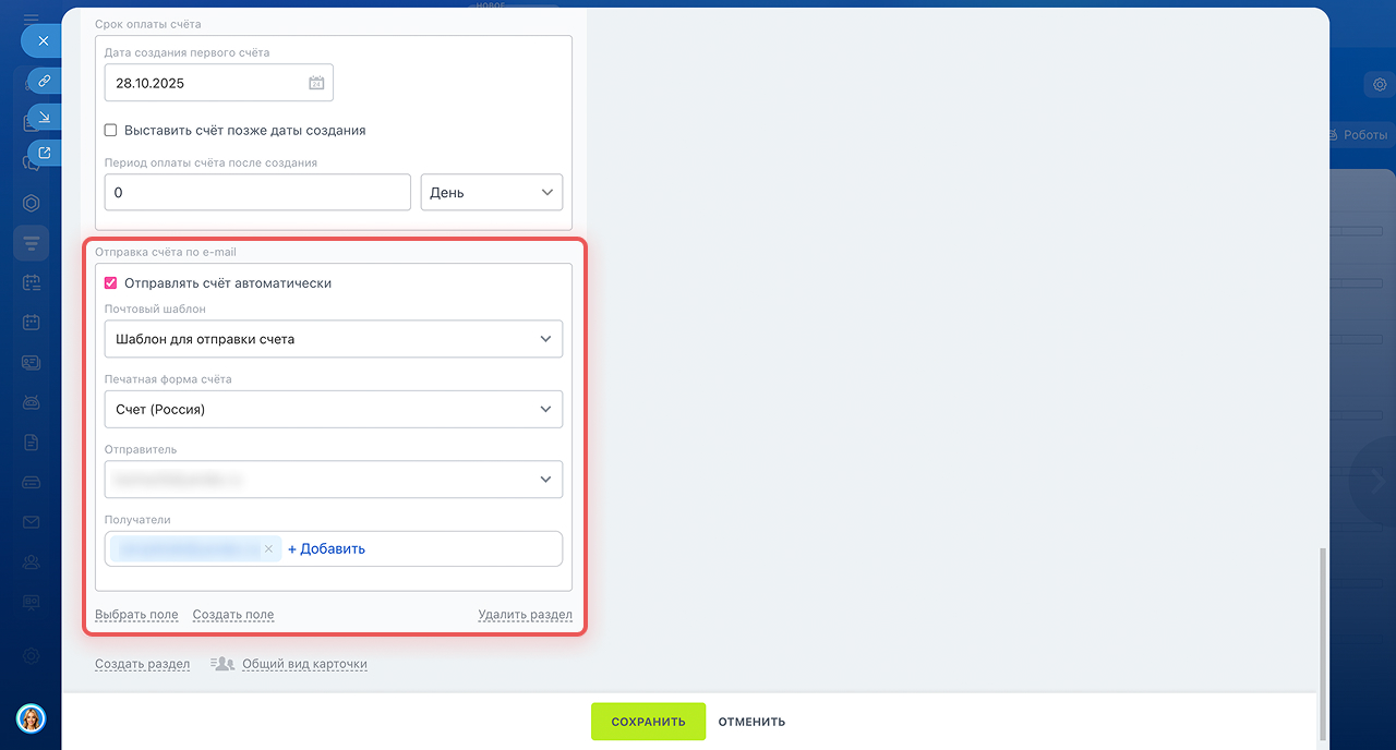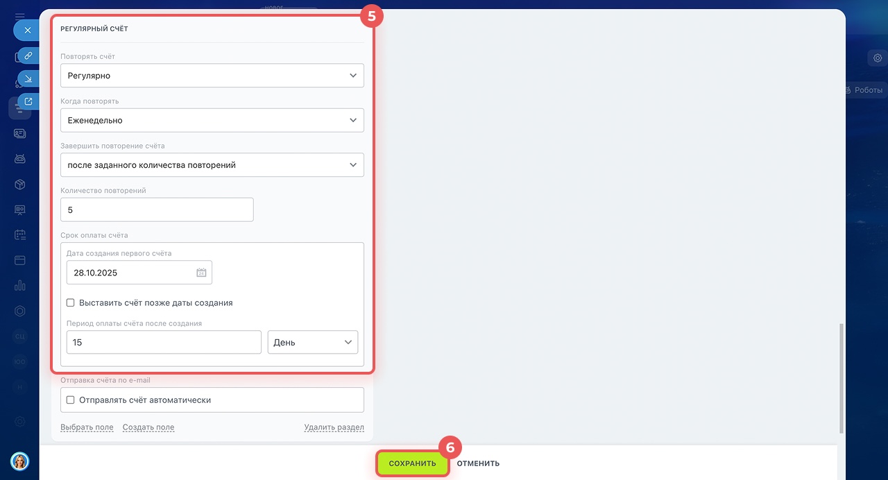 Чтобы регулярный счет автоматически отправлялся клиенту, включите опцию Отправлять счет автоматически и заполните поля:
