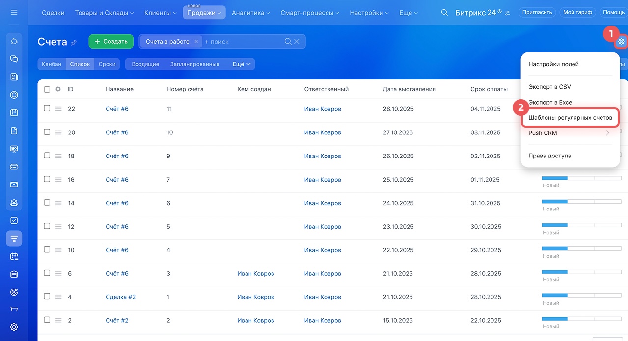 После создания регулярного счета CRM сохраняет его как шаблон. Все такие шаблоны собираются в отдельный список — здесь можно увидеть, какие счета настроены, кто за них отвечает и когда создаются новые документы