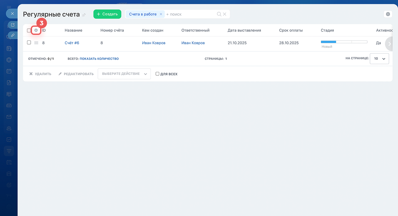 - После создания регулярного счета CRM сохраняет его как шаблон. Чтобы посмотреть все регулярные счета, перейдите в Настройки (⚙️) > Шаблоны регулярных счетов.
