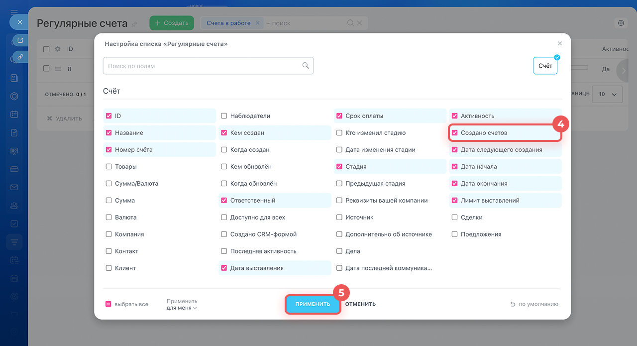3–5. Если нужные столбцы не отображаются, перейдите в Настройки (⚙️) в правом верхнем углу таблицы и выберите нужные поля. Например, отметьте поле Создано счетов, чтобы видеть общее количество счетов, созданных по каждому шаблону.