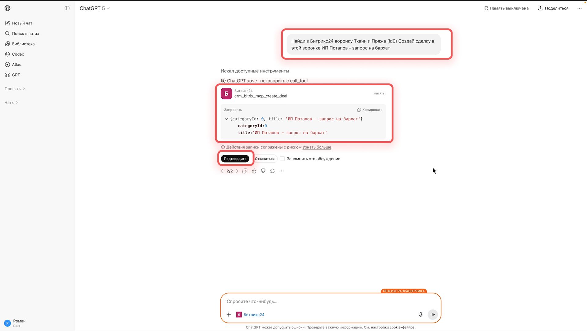 - управлять вашим Битрикс24 в чате со сторонней AI-системой.