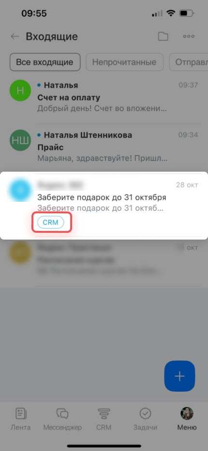 Нажмите и удерживайте нужное письмо, выберите действие — например, добавить в CRM. Рядом с таким письмом появится надпись CRM, и вы сможете быстро перейти в связанную карточку.