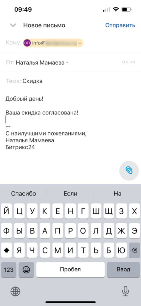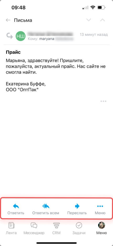 - После подключения почты в мобильном приложении вы можете выполнять все основные действия с письмами: читать их, отвечать, пересылать, создавать задачи, события, карточки CRM и так далее.